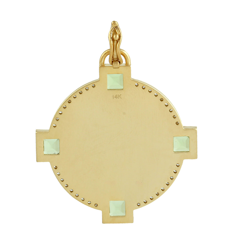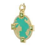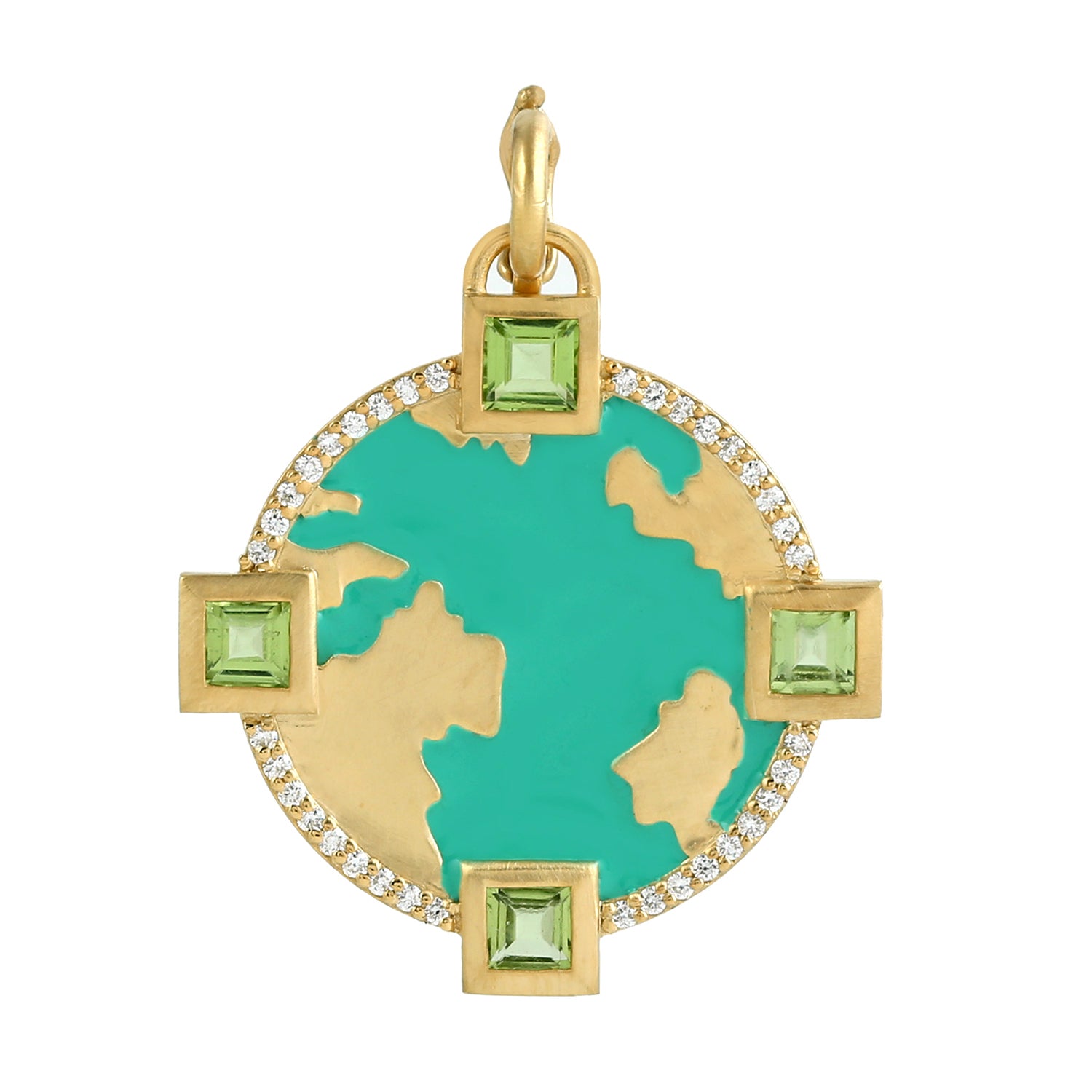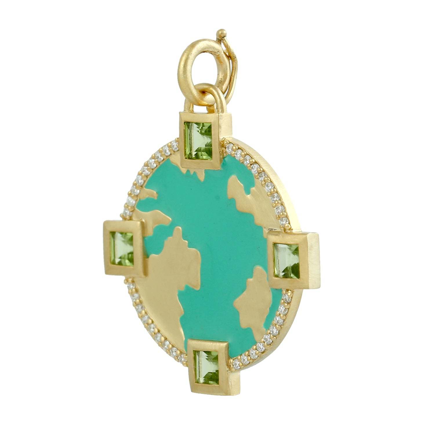 Square Cut Peridot Pave Diamond World Map Design Pendant In 14K Yellow Gold