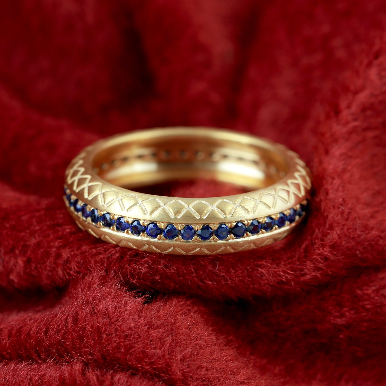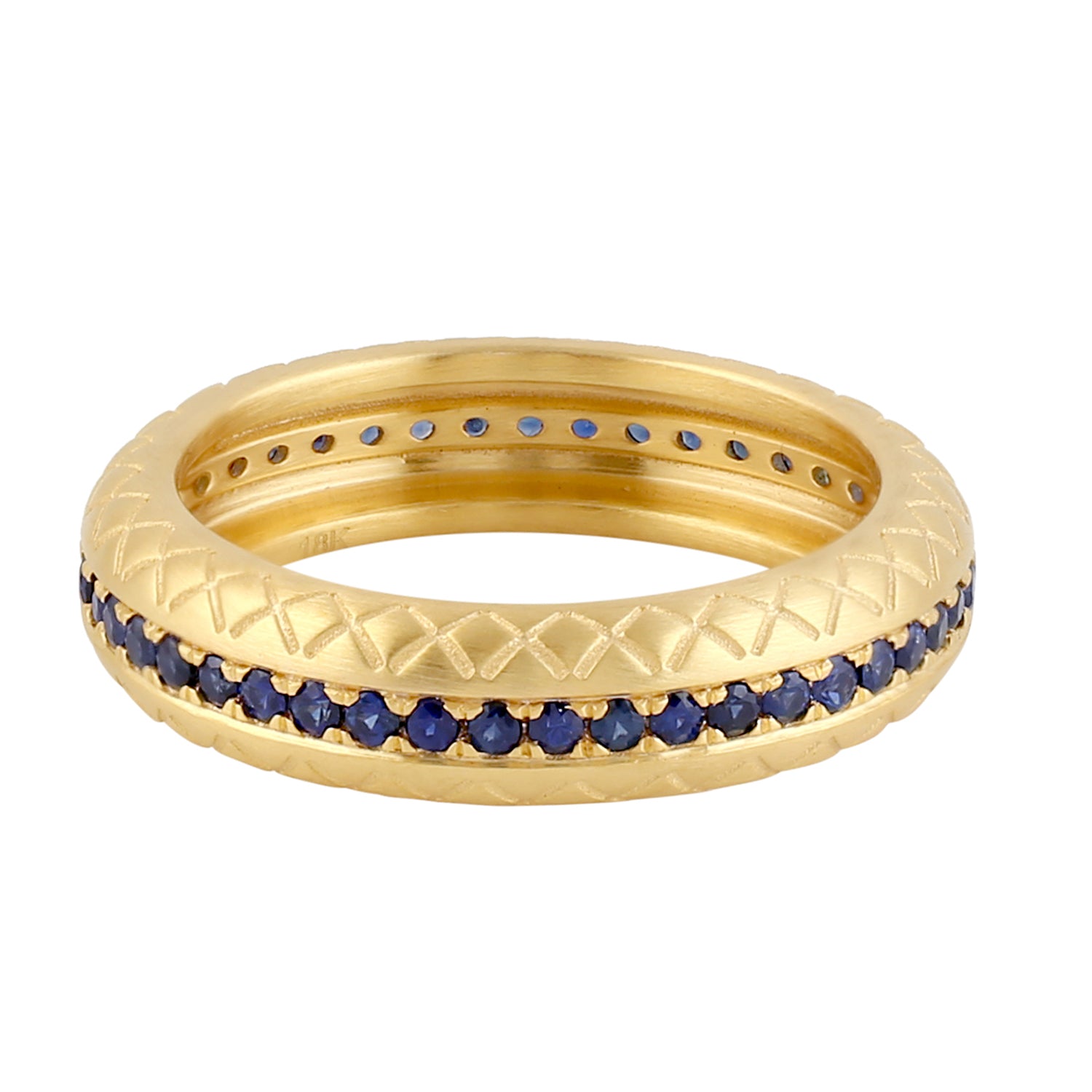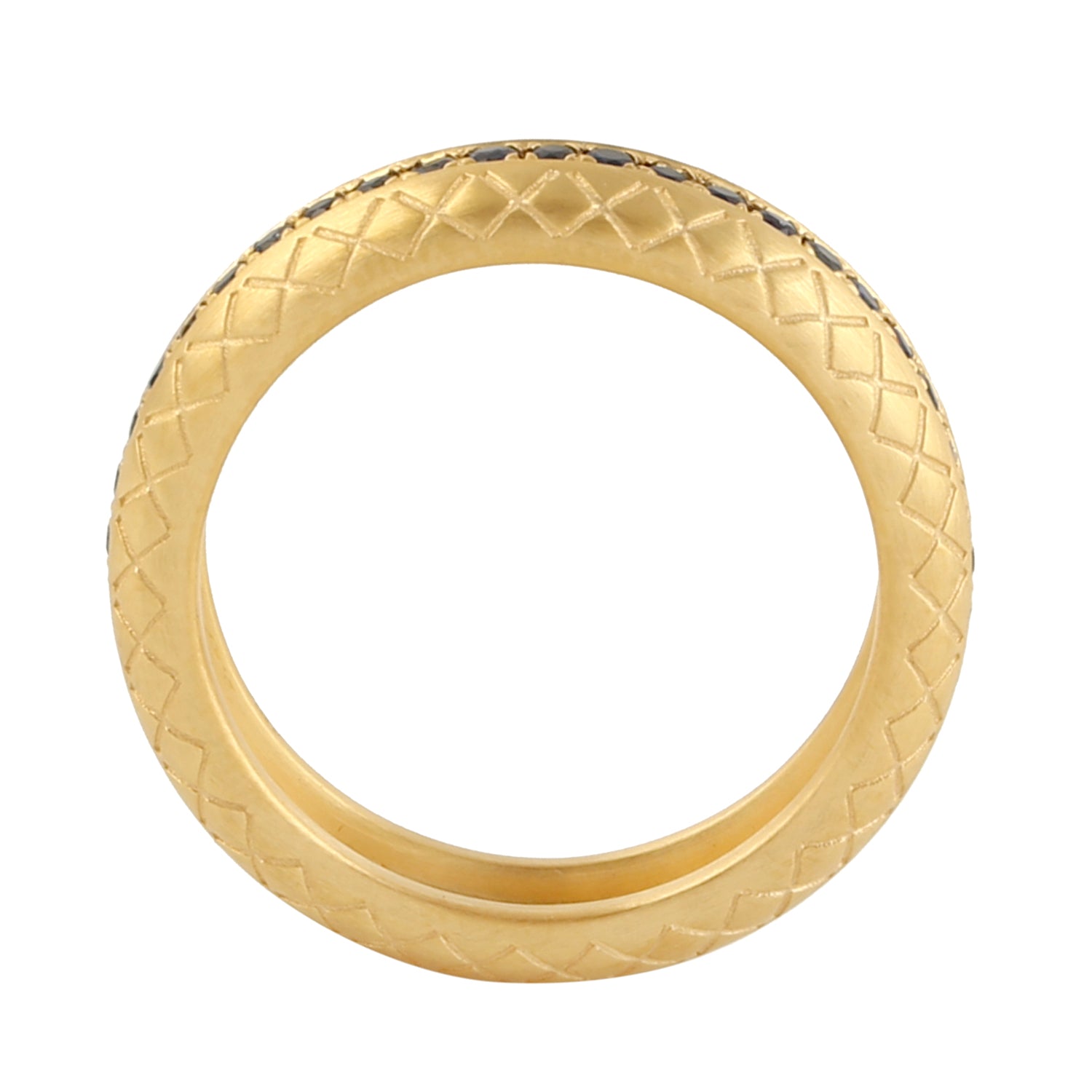 Pave Blue Sapphire Gemstone Designer Band Ring In 18K Yellow Gold