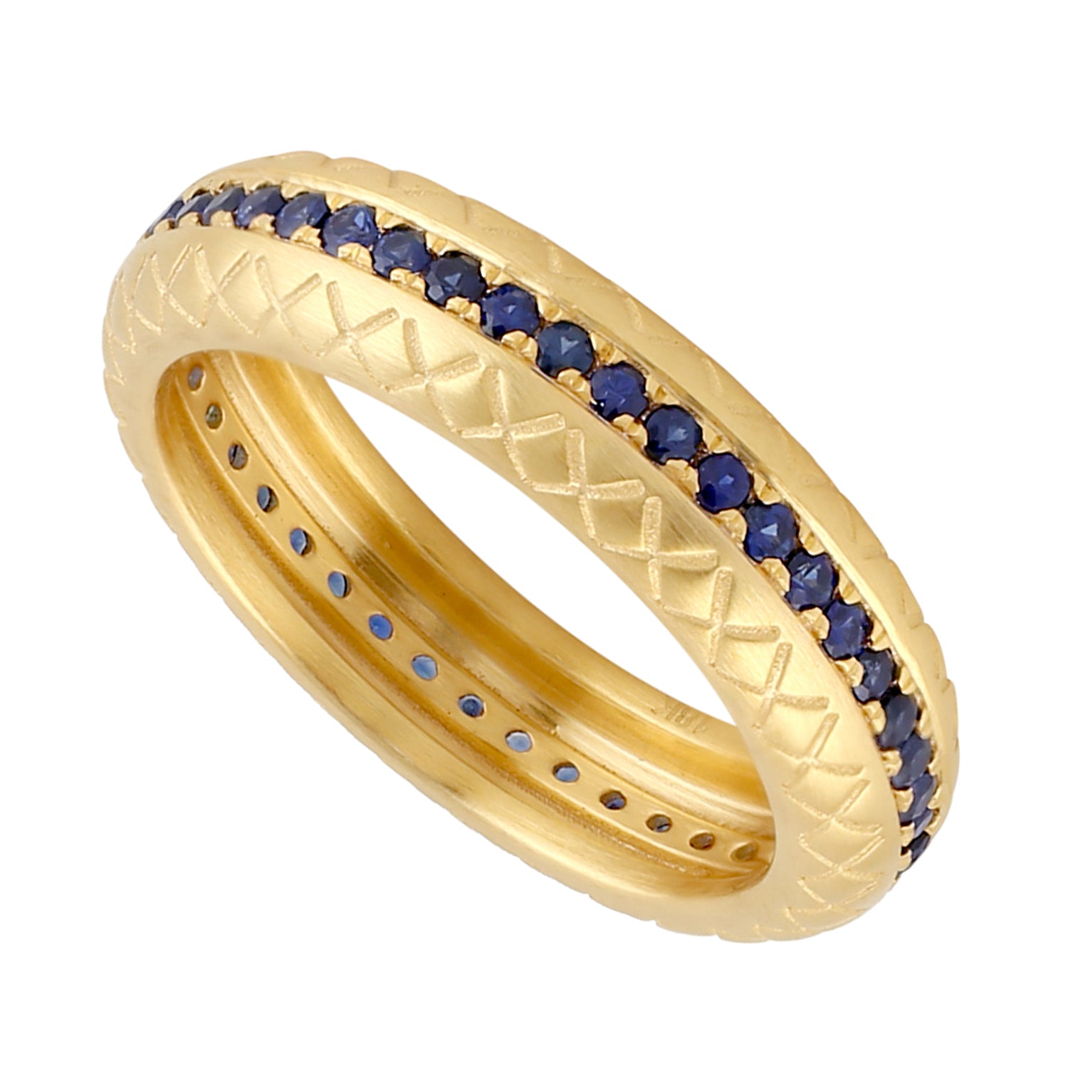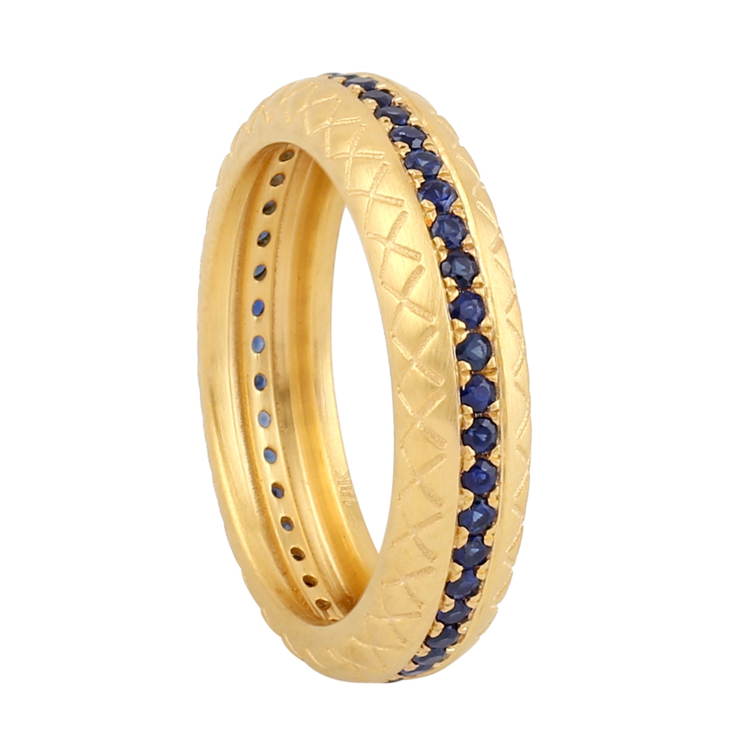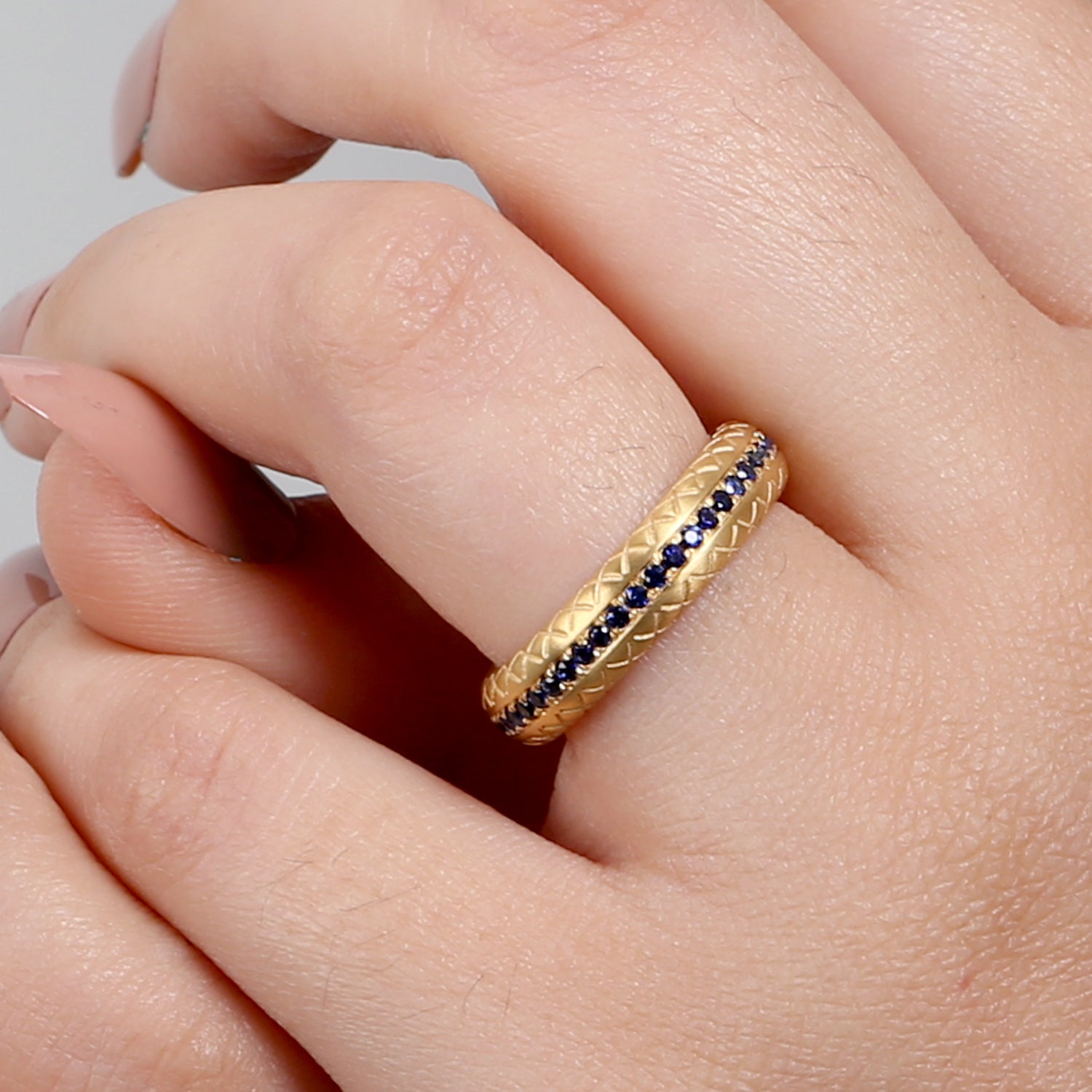 Pave Blue Sapphire Gemstone Designer Band Ring In 18K Yellow Gold