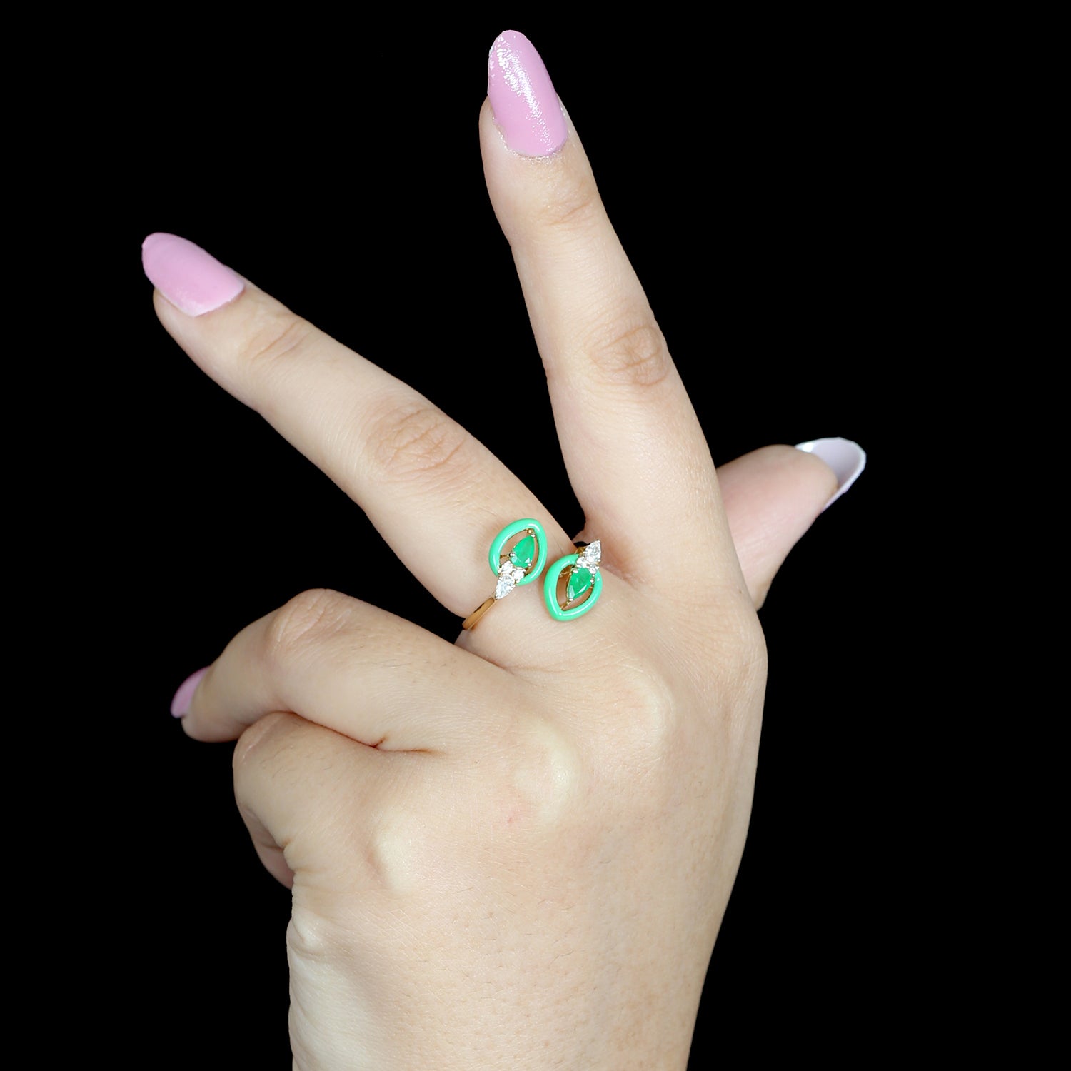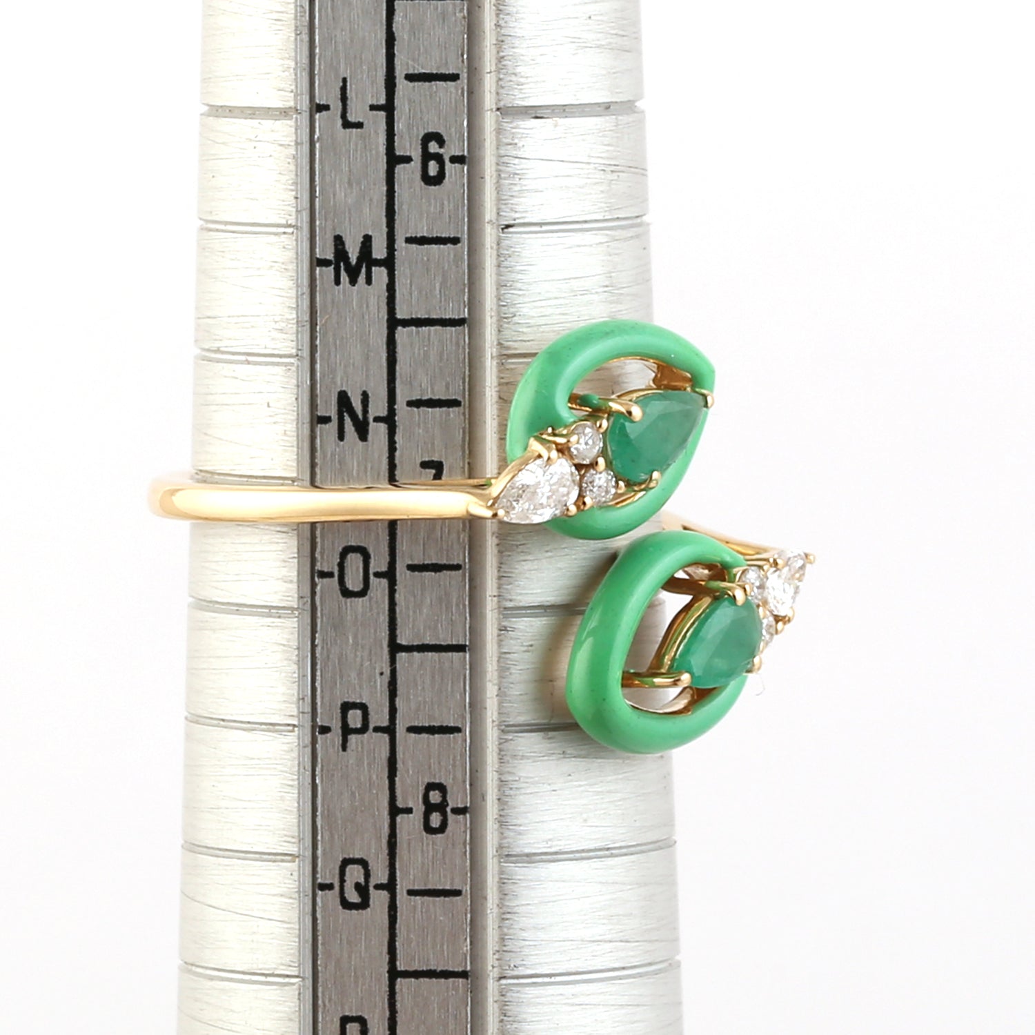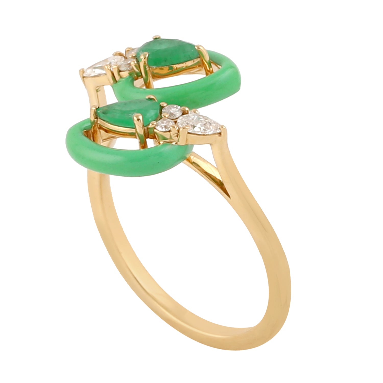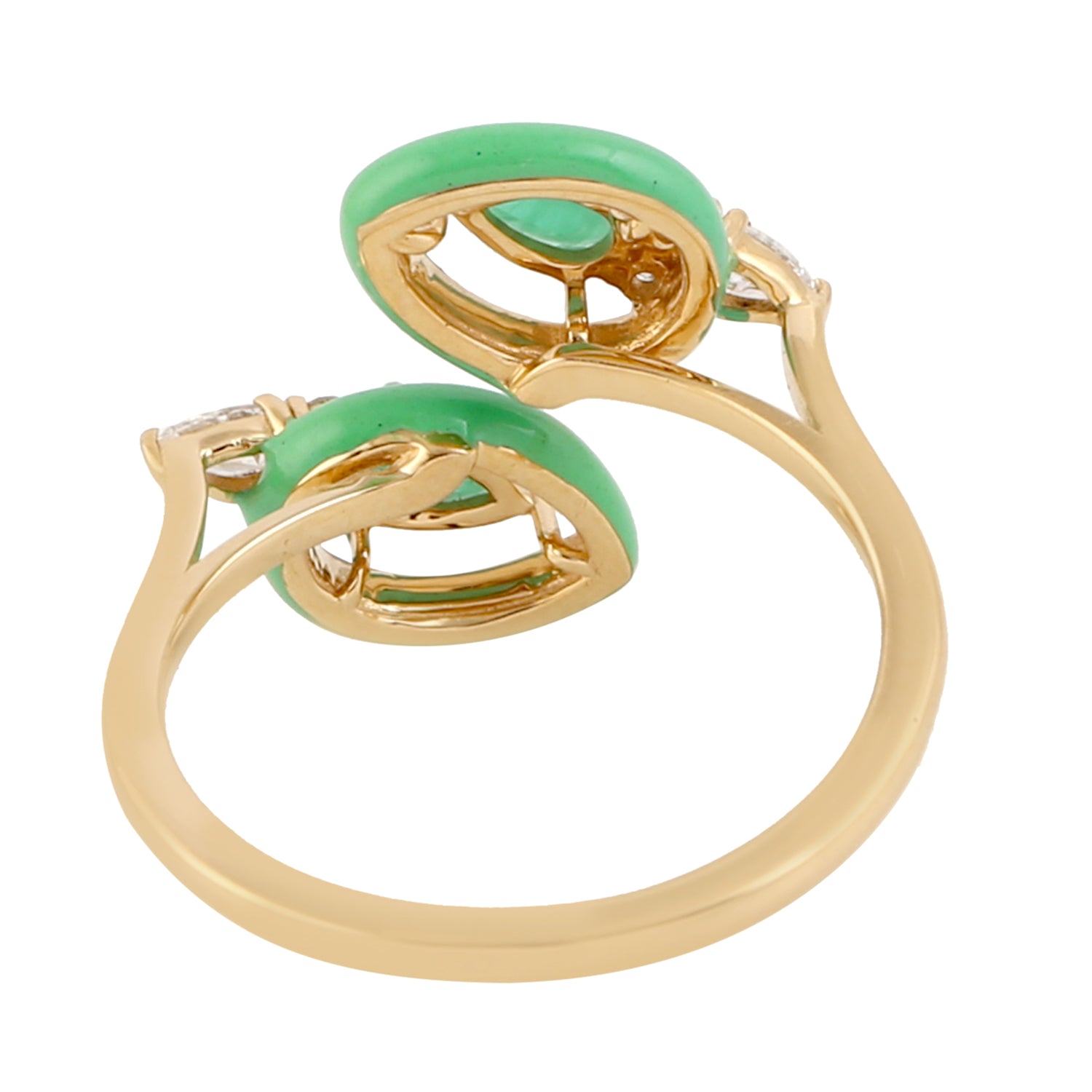 18K Yellow Gold Pear Cut Emerald Rose Cut Diamond Enamel Bypass Ring