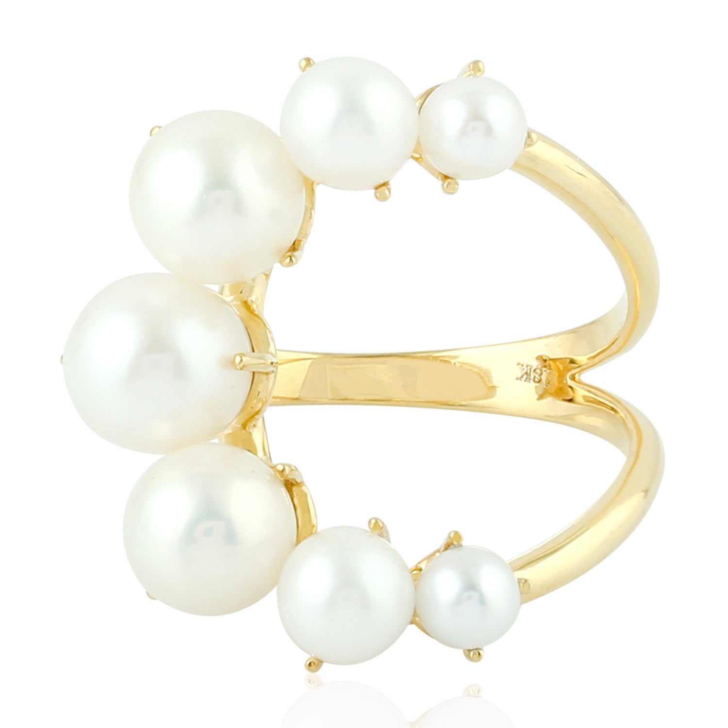 18K Yellow Gold Beaded Pearl Gemstone Between The Finger Ring