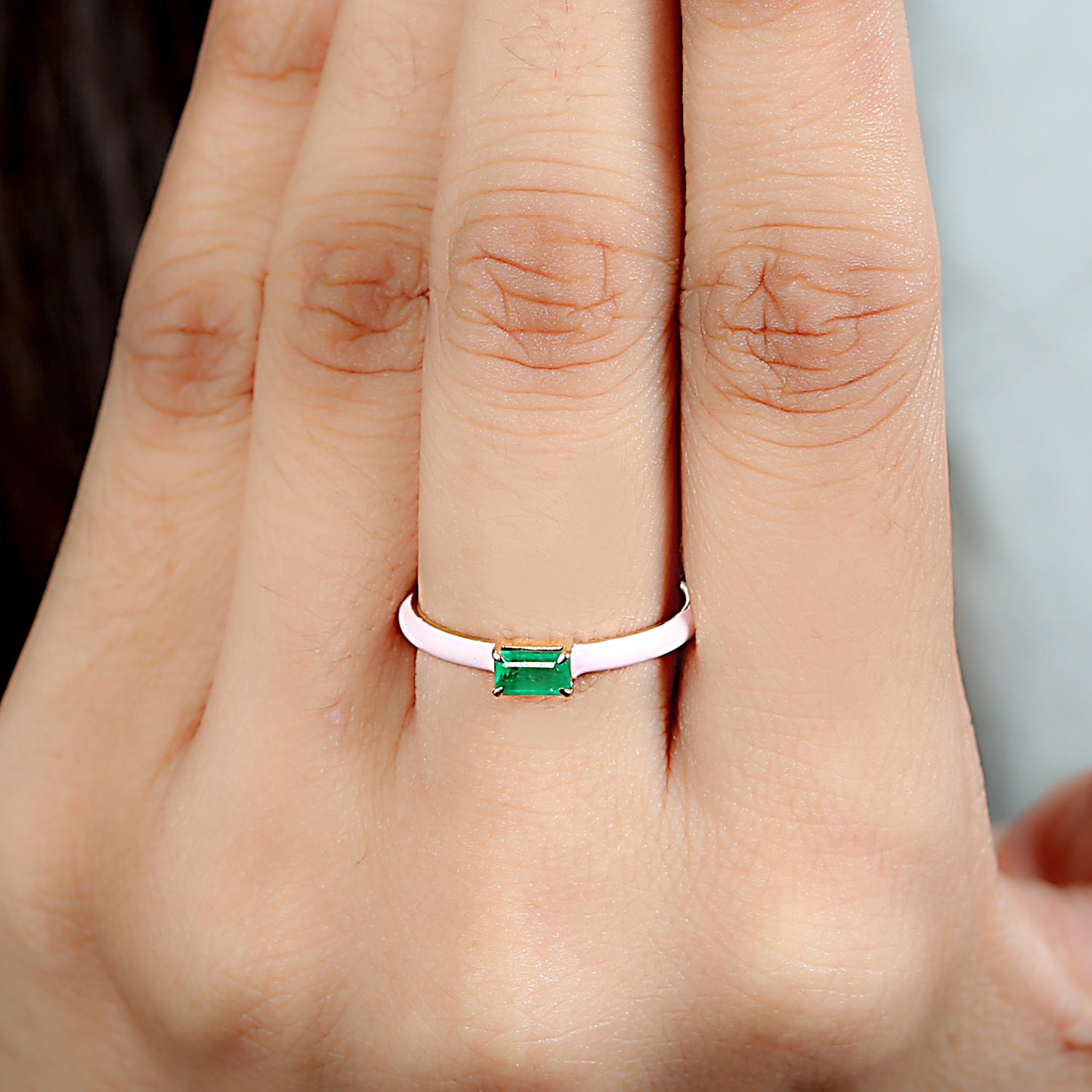 Baguette Emerald May Birthstone In Yellow Gold Pink Enamel Delicate Band Ring