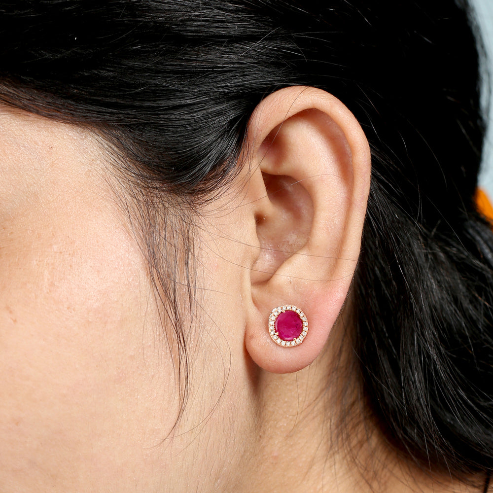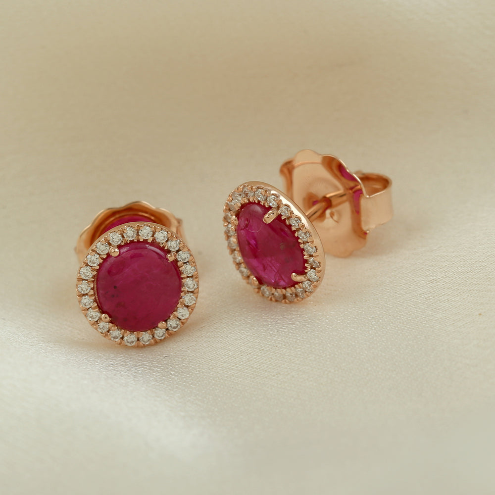 18k Rose Gold Prong Ruby July Birthstone Pave Diamond Halo Stud Earrings