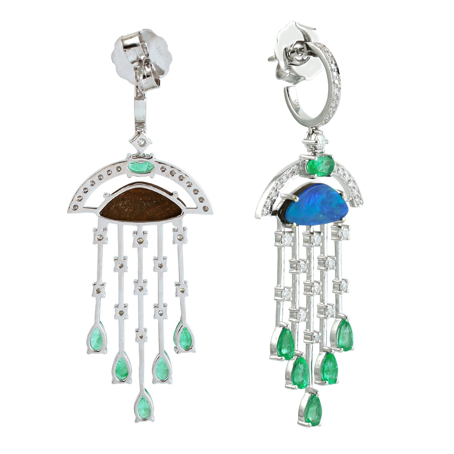 Opal Doublet & Emerald Prong Diamond Chandelier Earrings in 14K White Gold