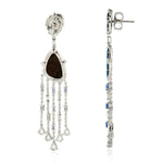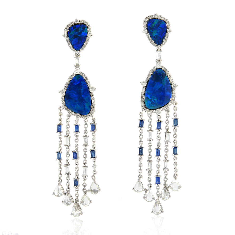 Oval Cut Opal Doublet Baguette Blue Sapphire Pave Diamond Chandelier Earrings In White Gold