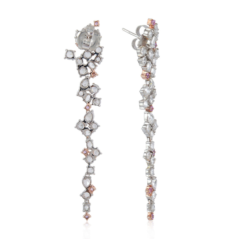 Pink Sapphire & Rose-Cut Diamond Long Drop Earrings in 18K White and Rose Gold