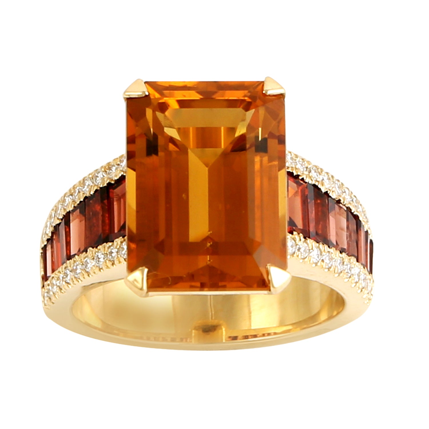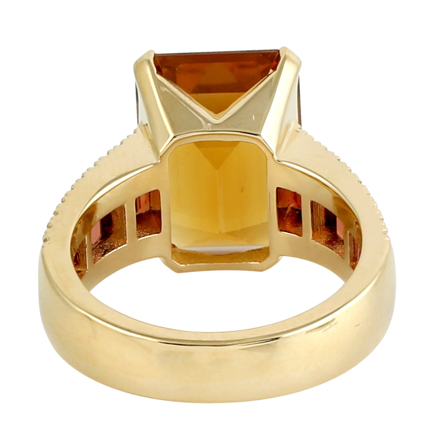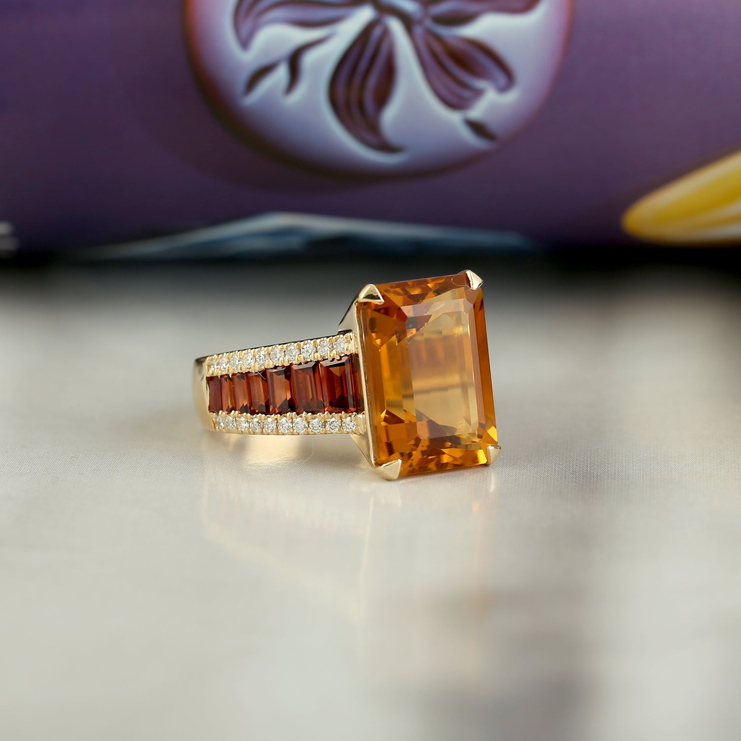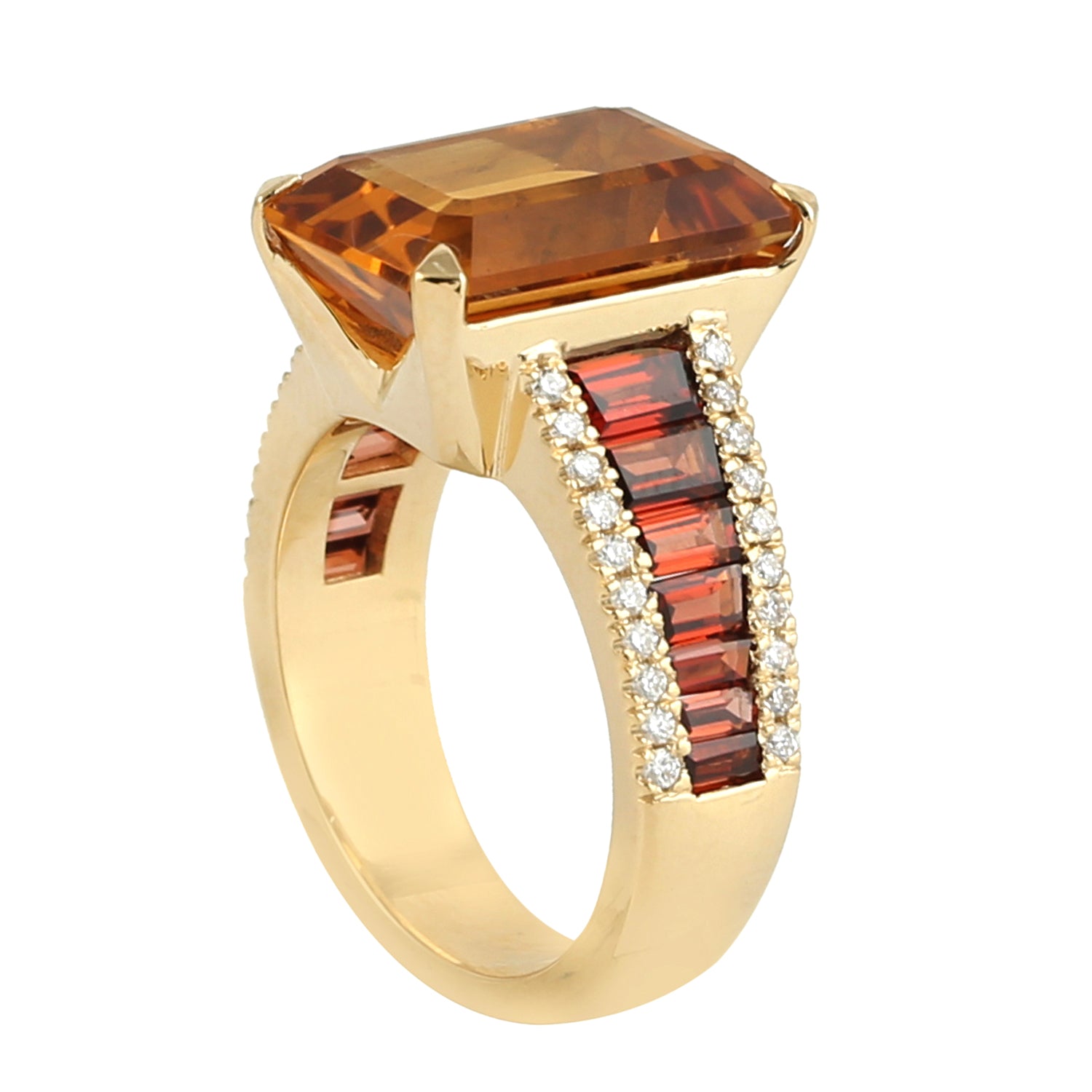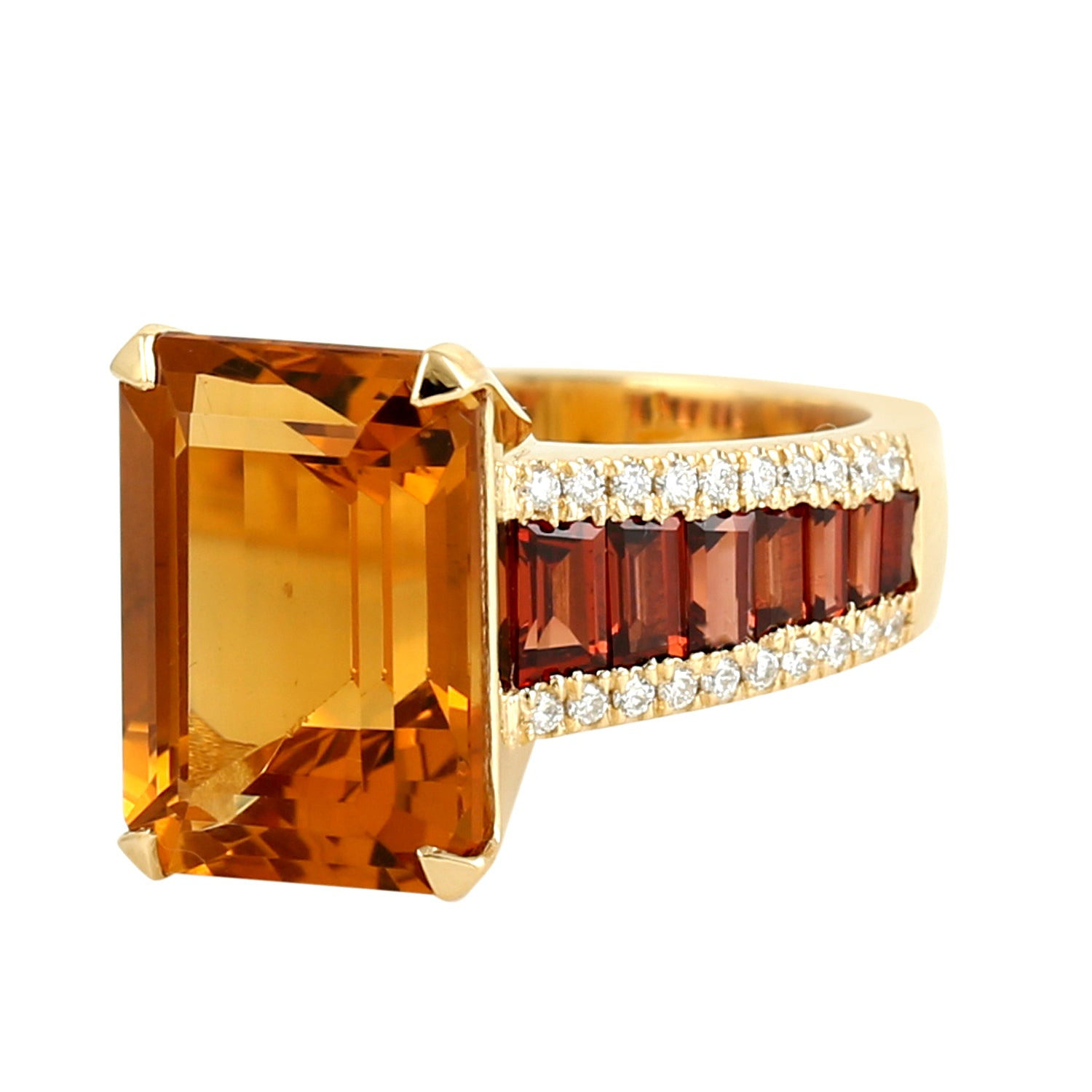 Emerald Cut Citrine Channel Set Garnet Pave Diamond Cocktail Ring In Yellow Gold