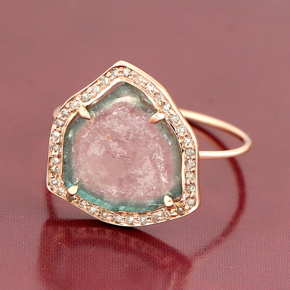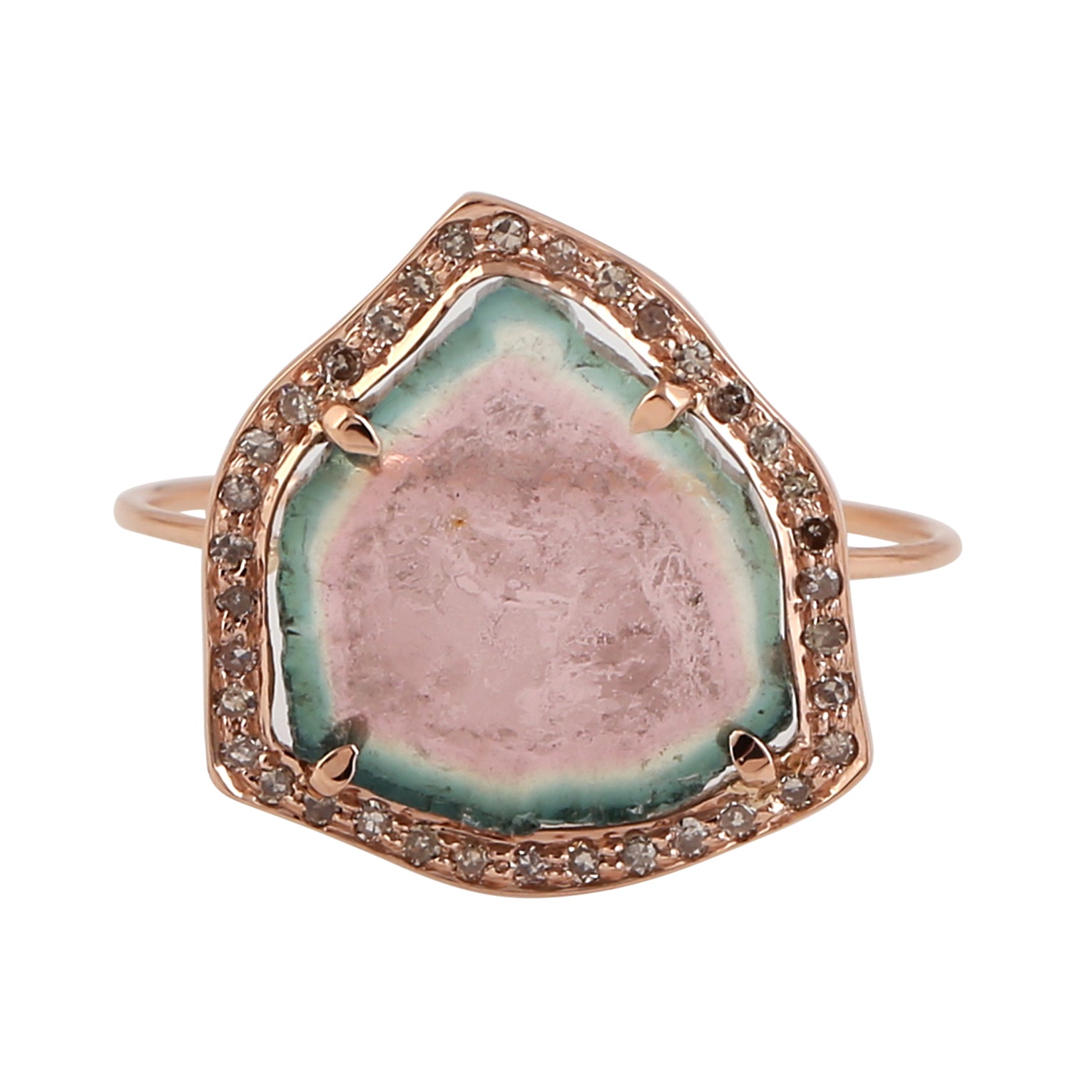 Unshaped Tourmaline Melon Pave Diamond Cocktail Ring In 14k Rose Gold