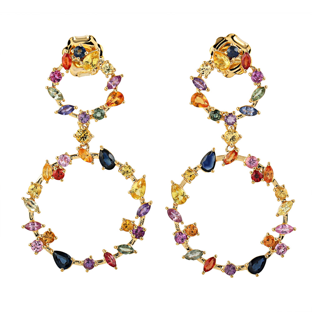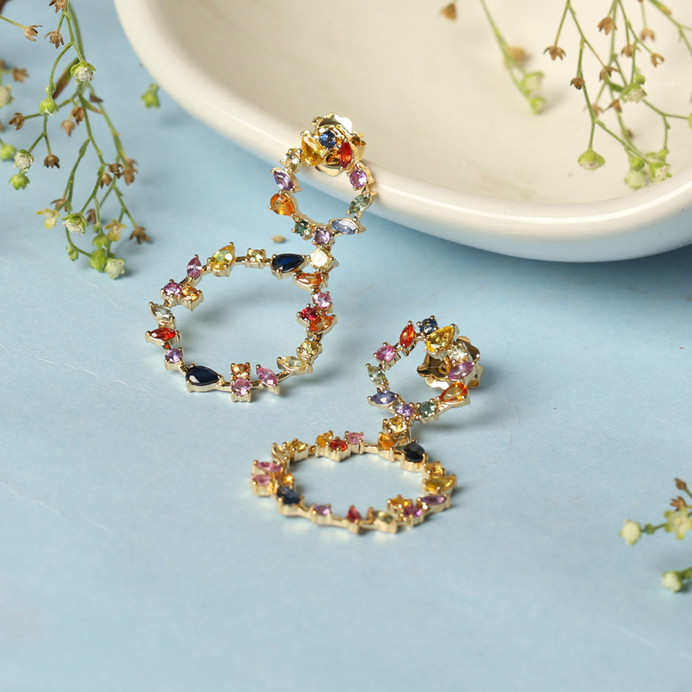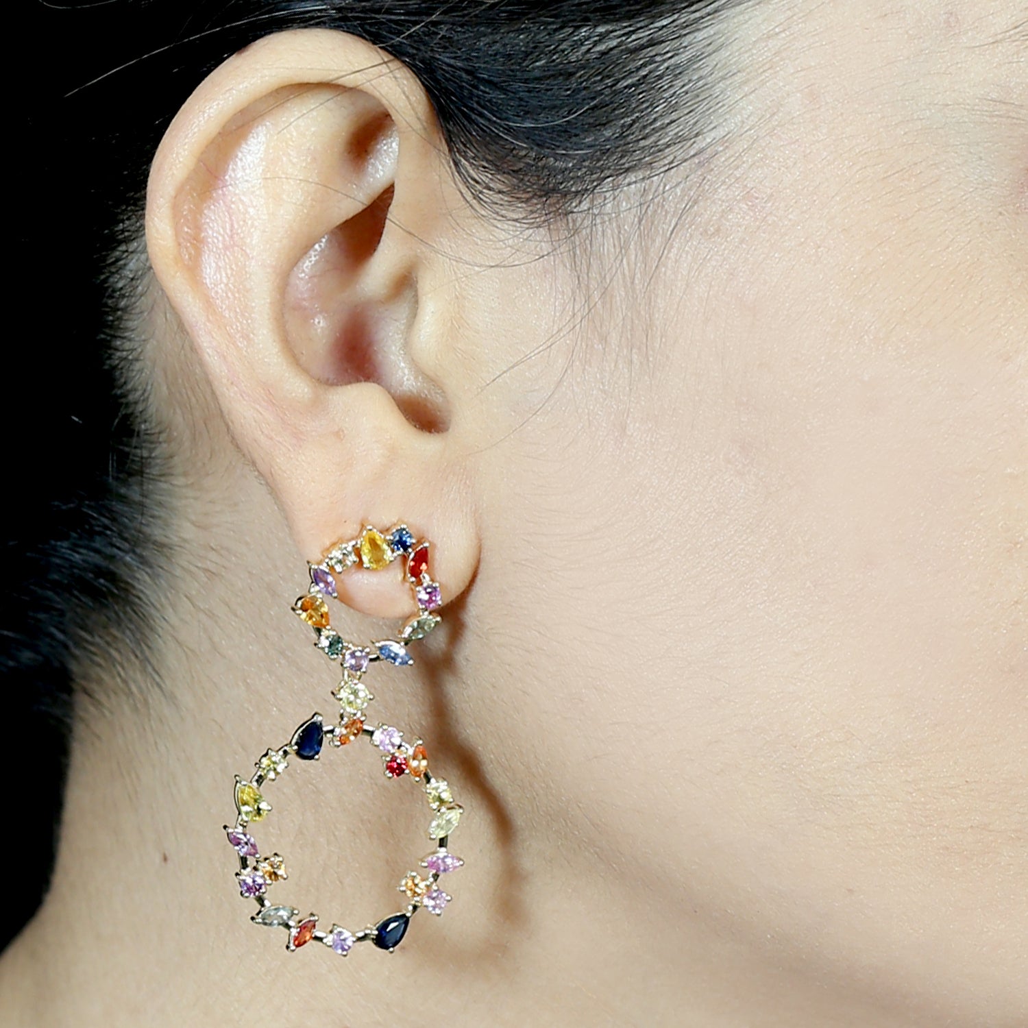 18k Yellow Gold Multi Sapphire Gemstone Dangle Earrings Handmade Jewelry