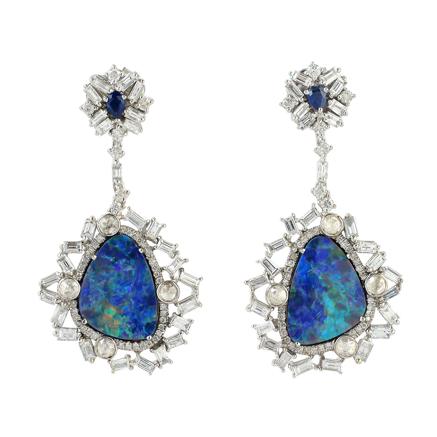 Blue Opal, Sapphire & Diamond Halo Cluster Drop Earrings in 18K White Gold