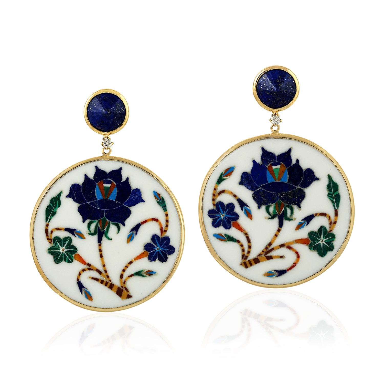 Lapis & Diamond Floral Bakelite Drop Earrings in 18K Yellow Gold