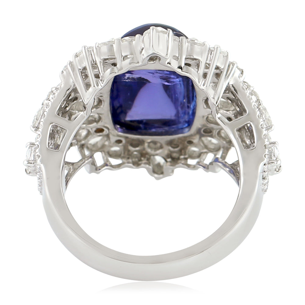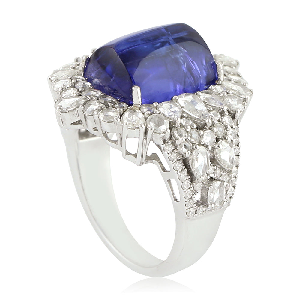 Cushion Cut Tanzanite Rose Diamond Cocktail Ring In 18K White Gold