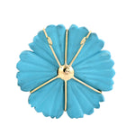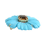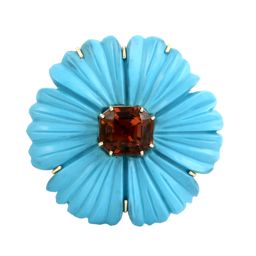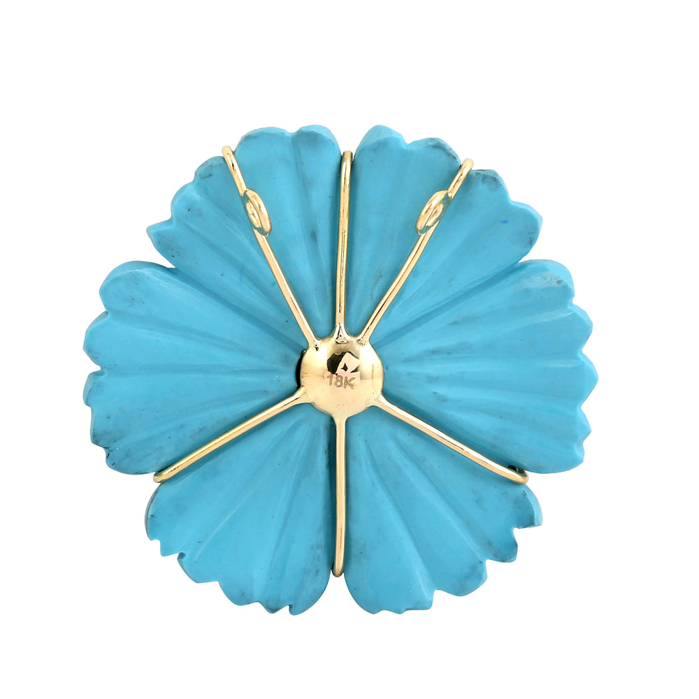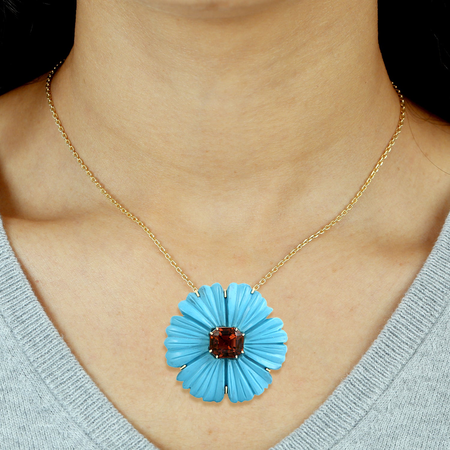 Octagon Cut Pink Tourmaline & Carved Turquoise Flower Pendant in 18K Yellow Gold