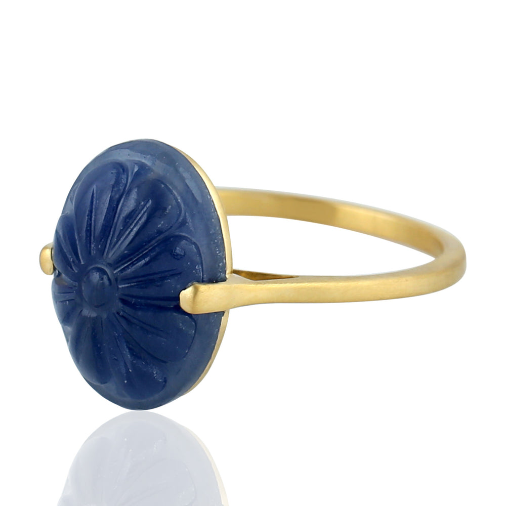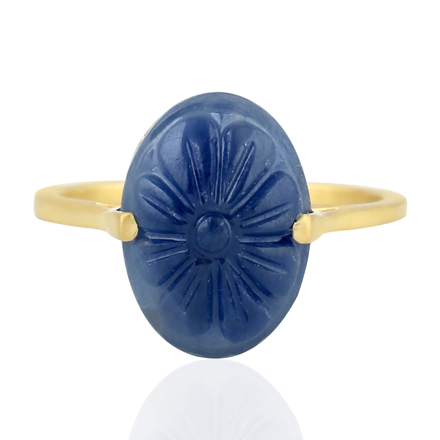 • Carved Blue Sapphire In 18k Yellow Gold Handmade Designer Ring For Her