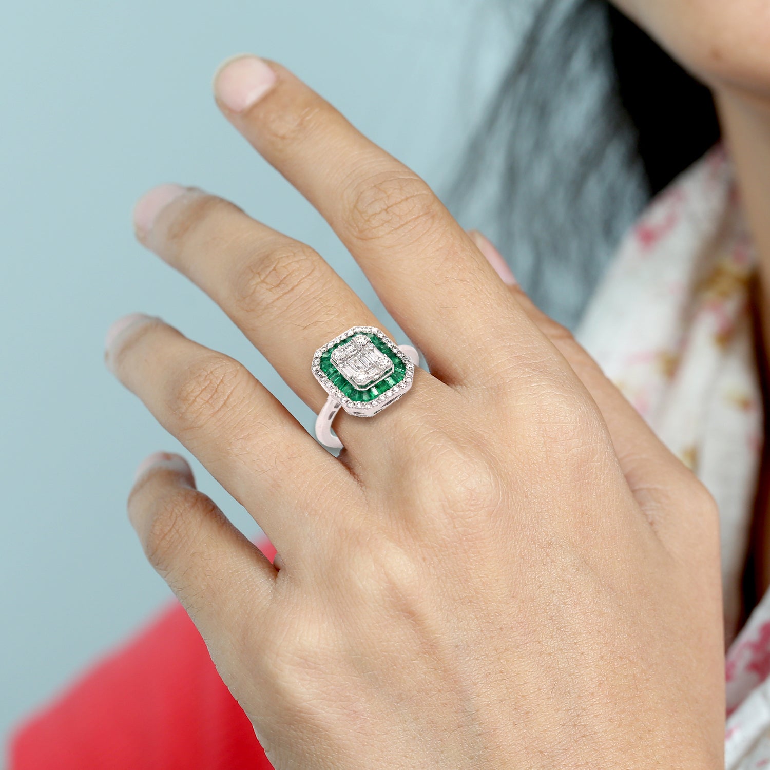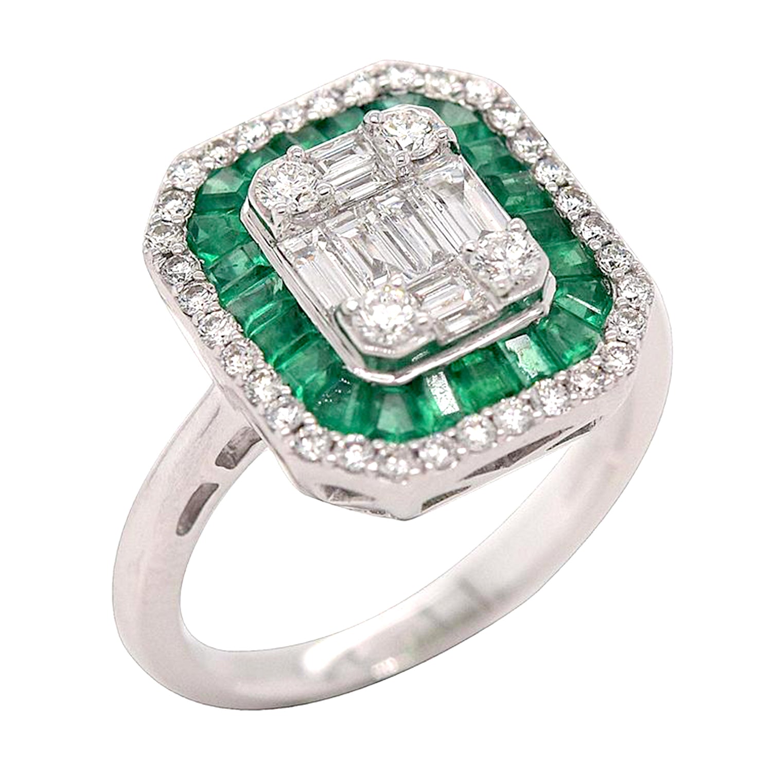 • Channel Set Emerald Pave Diamond Designer Ring In 18K White Gold