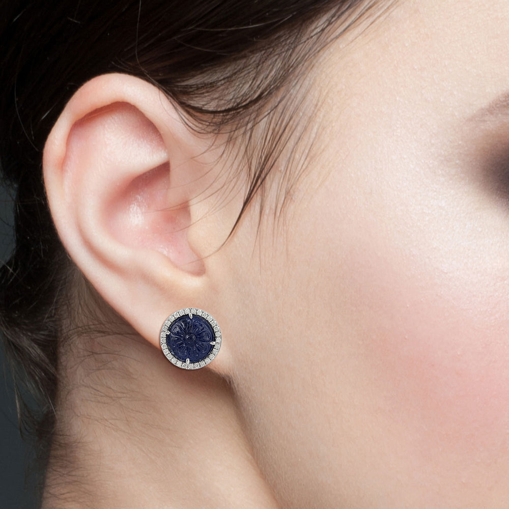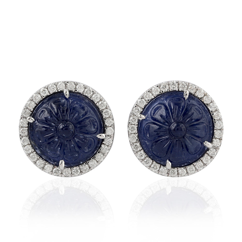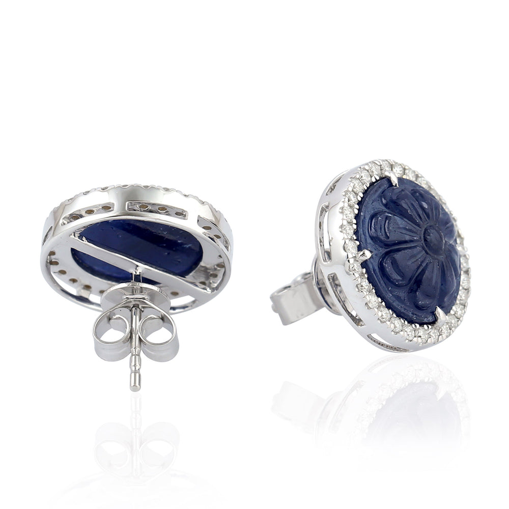 Carved Blue Sapphire Pave Diamond Stud Earrings In 18k White Gold