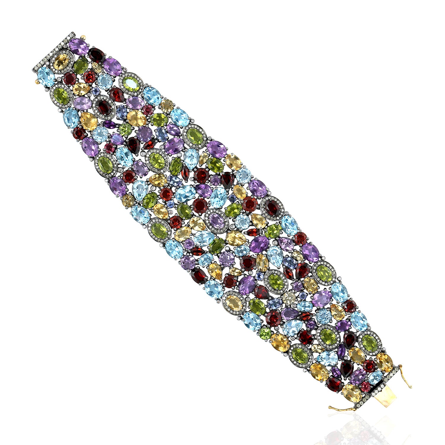 Yellow Gold 925 Sterling Silver Amethyst Multi Gemstone Fixed And Flexible Bracelet