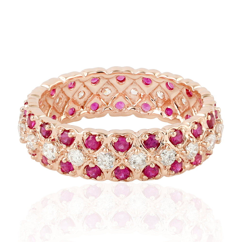 Ruby Gemstone Heart Eternity Band Ring with Prong Diamonds in 18k Rose Gold