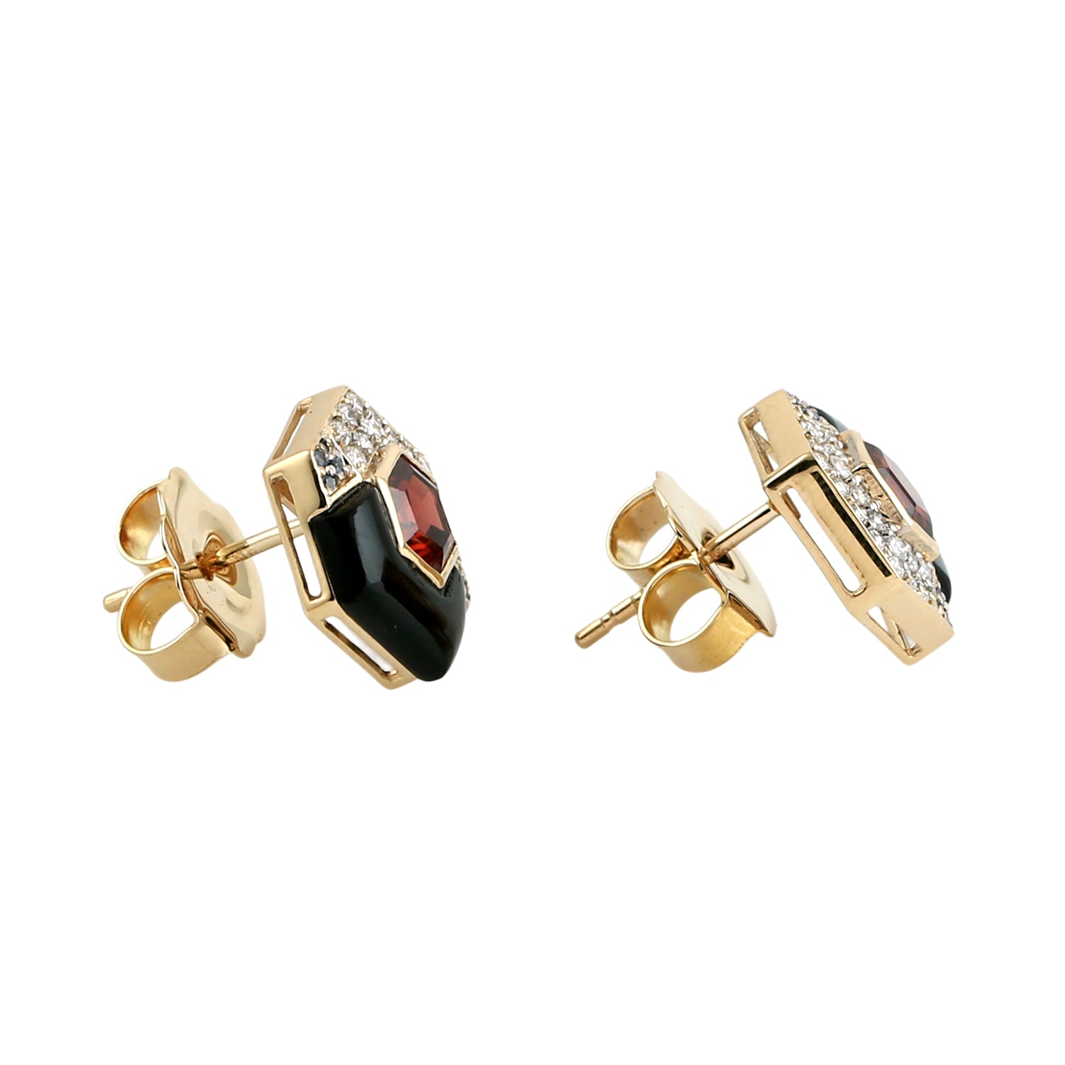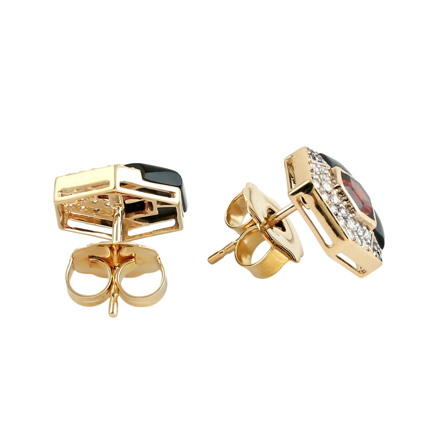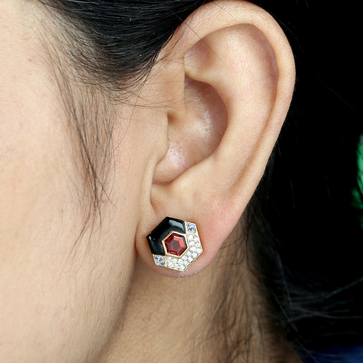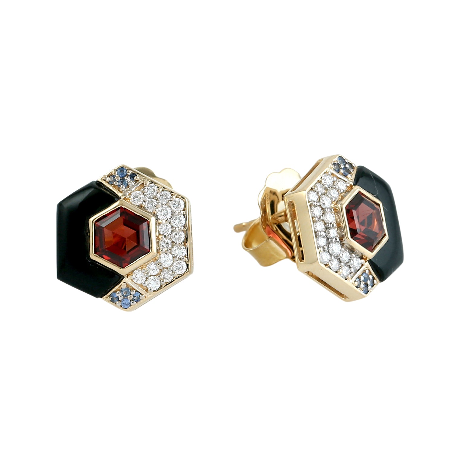 Black Onyx & Red Garnet Diamond Stud Earrings with Sapphire in 18K Yellow Gold
