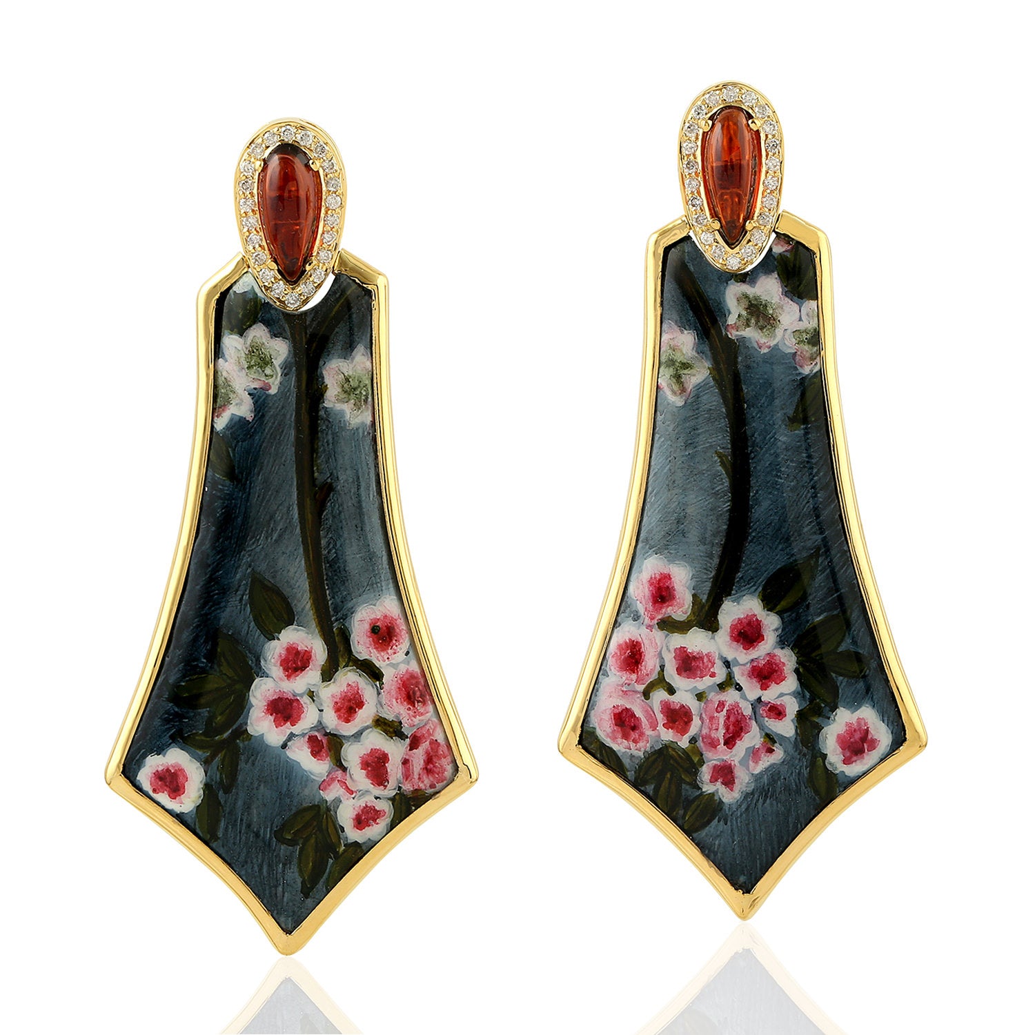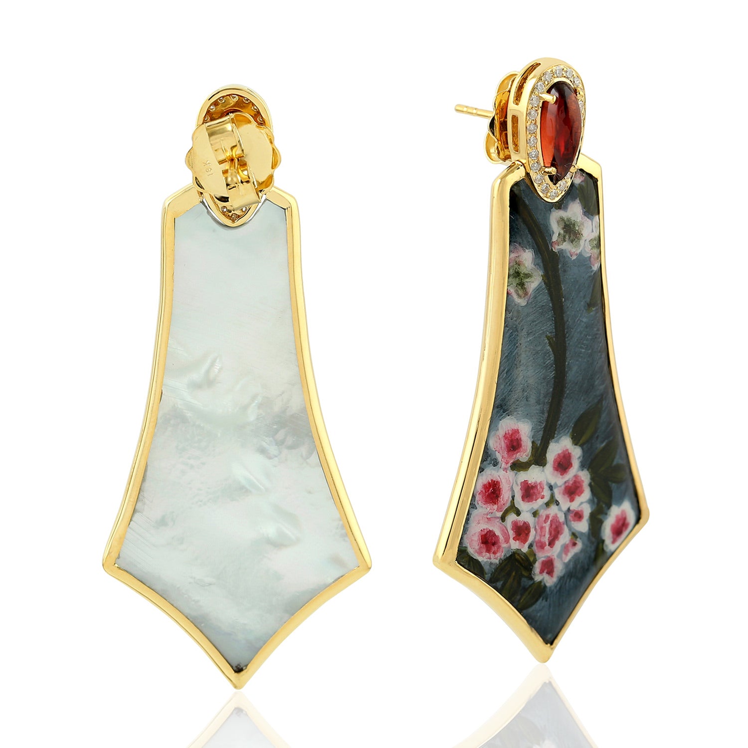 Cherry Blossom Hand-Painted Enamel Drop Earrings with Garnet & MOP Diamond in Gold