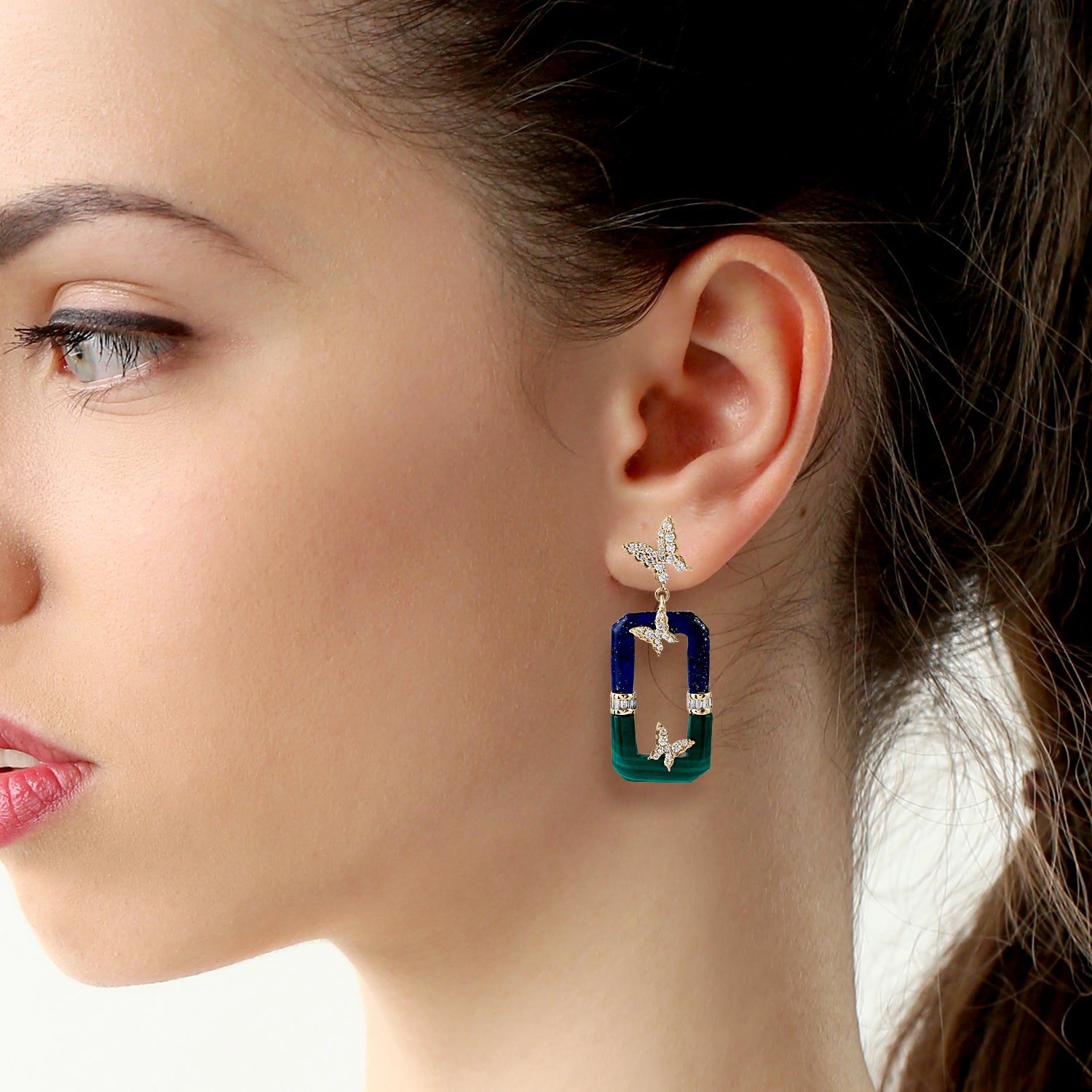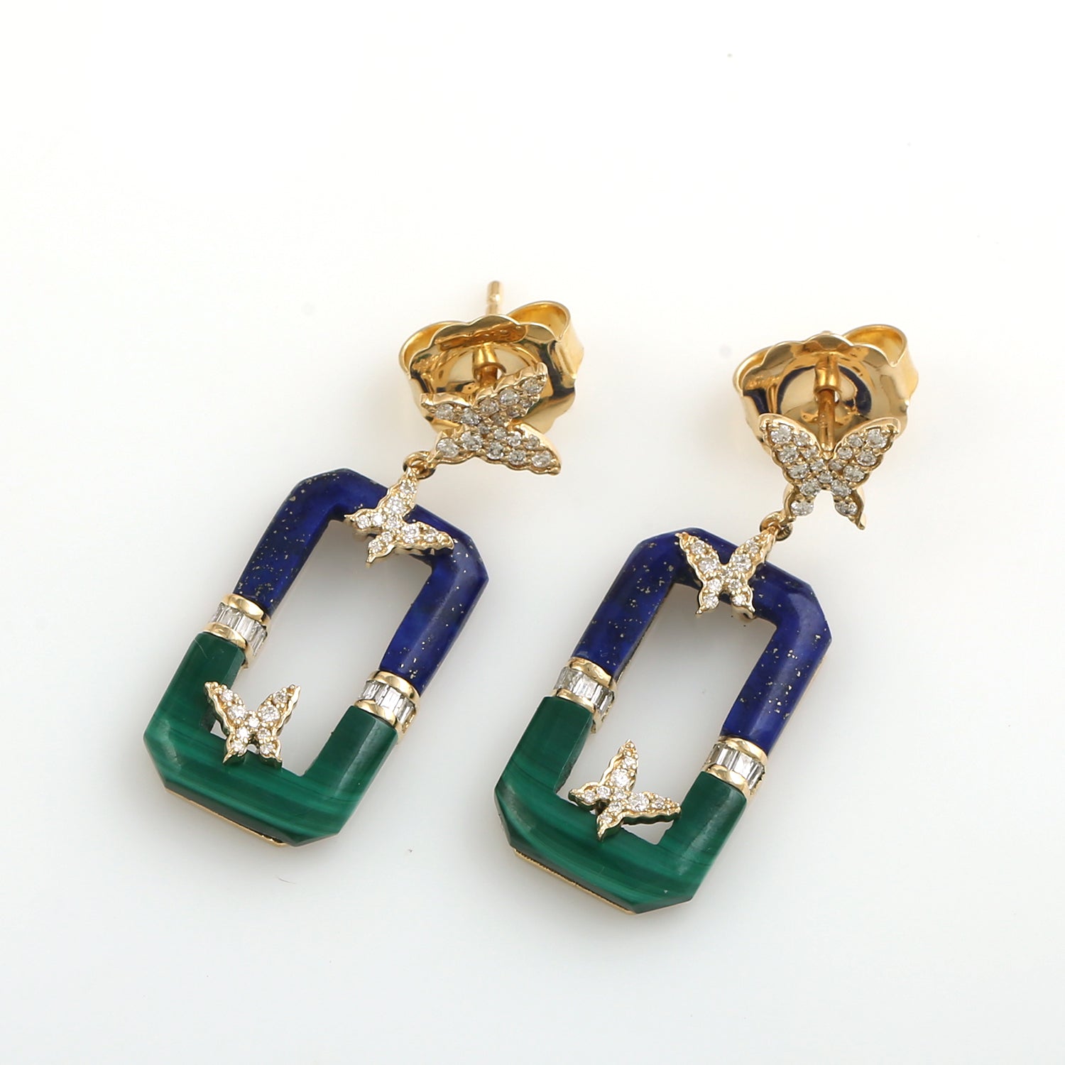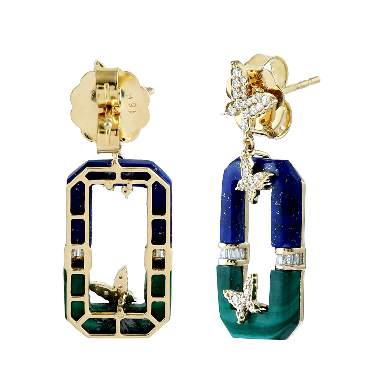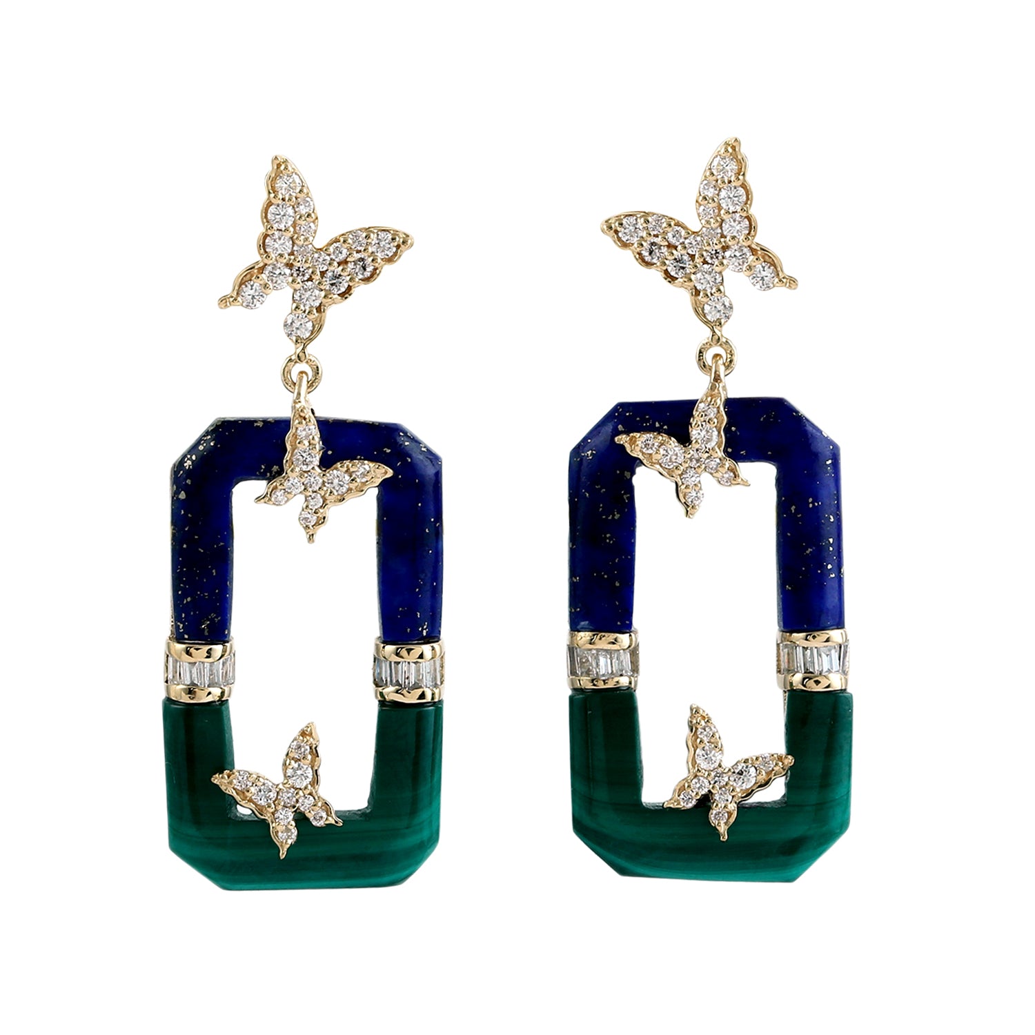 Lapis Lazuli & Malachite Diamond Butterfly Drop Earrings in 18K Yellow Gold