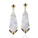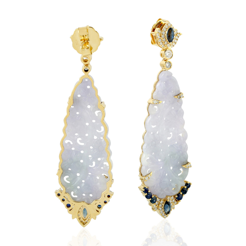 Carved Jade & Blue Sapphire Pave Diamond Lotus Danglers In 18k Yellow Gold