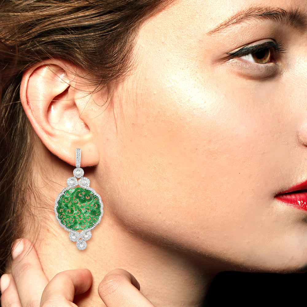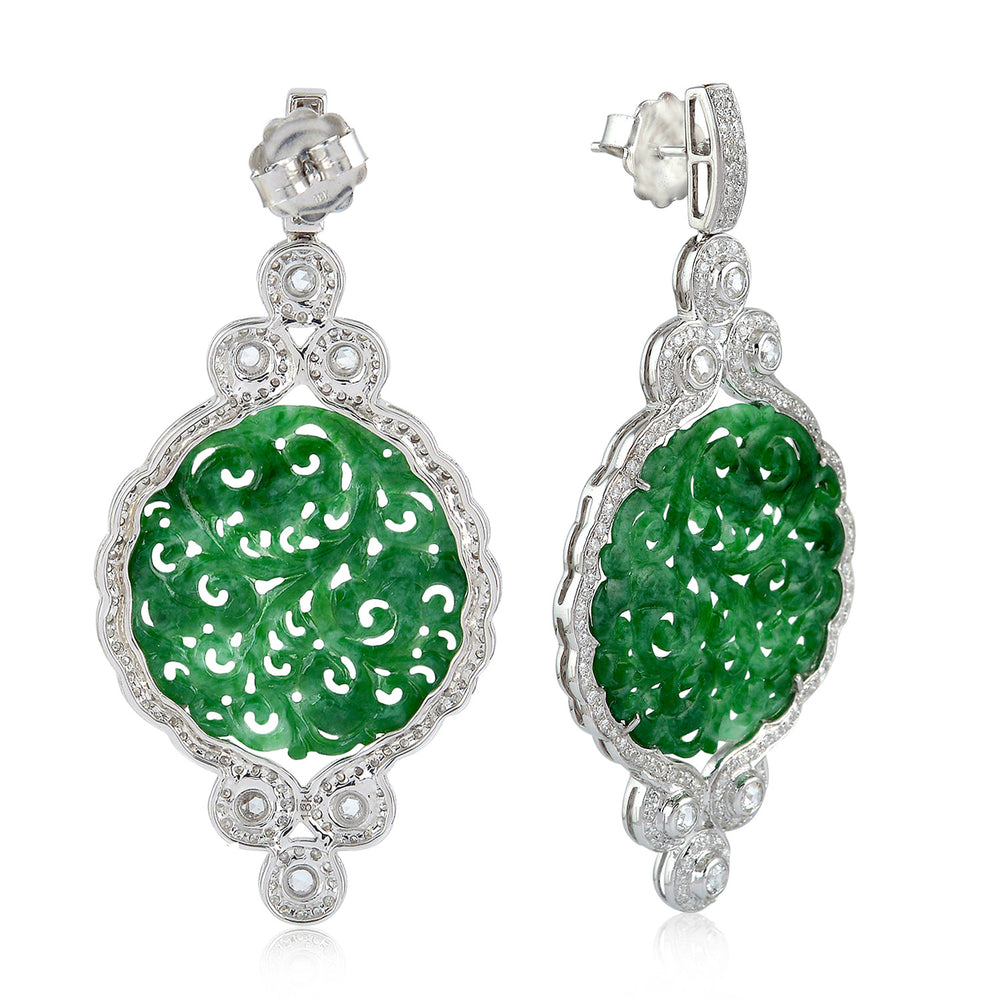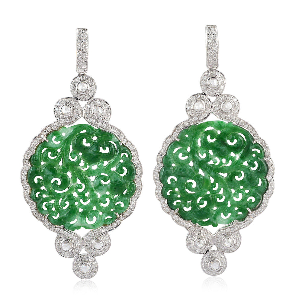 Jade Gemstone Dangle Earrings with Rose-Cut Diamonds in 18K White Gold
