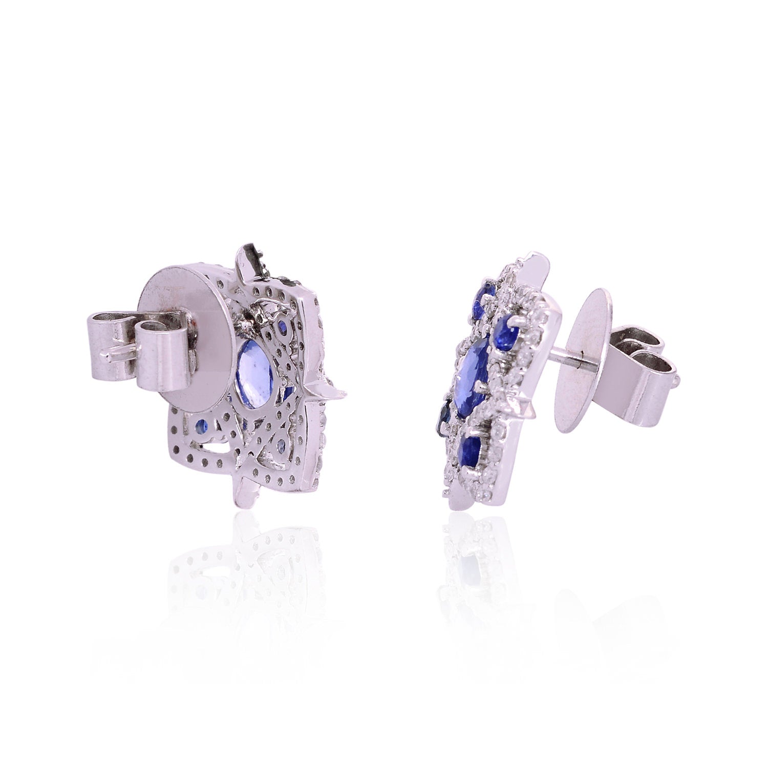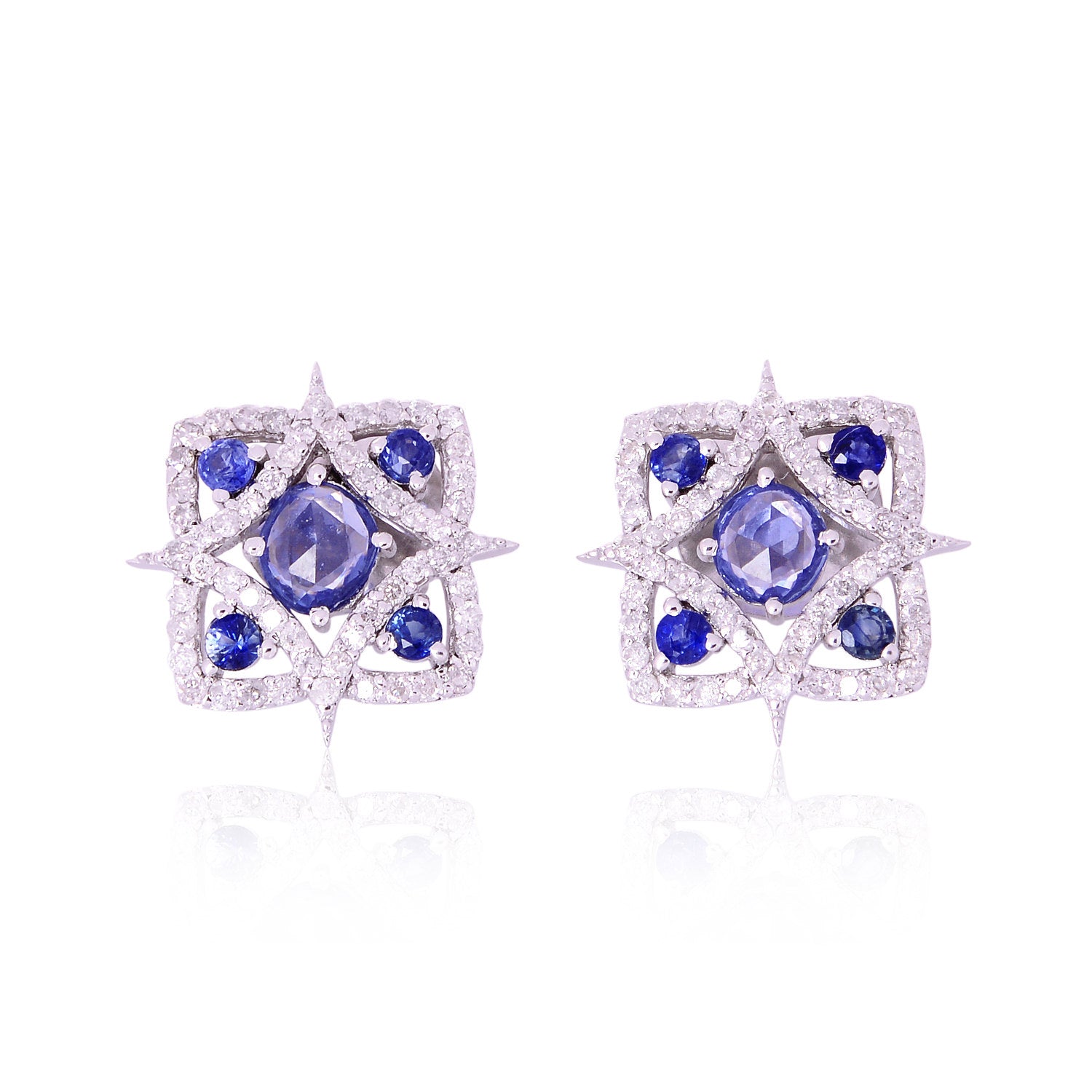 18K White Gold Prong Blue Sapphire Pave Diamond Star Stud Earrings For Women's