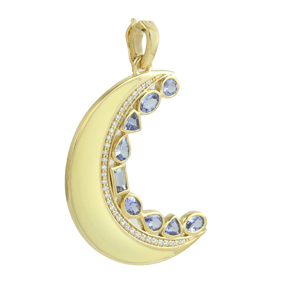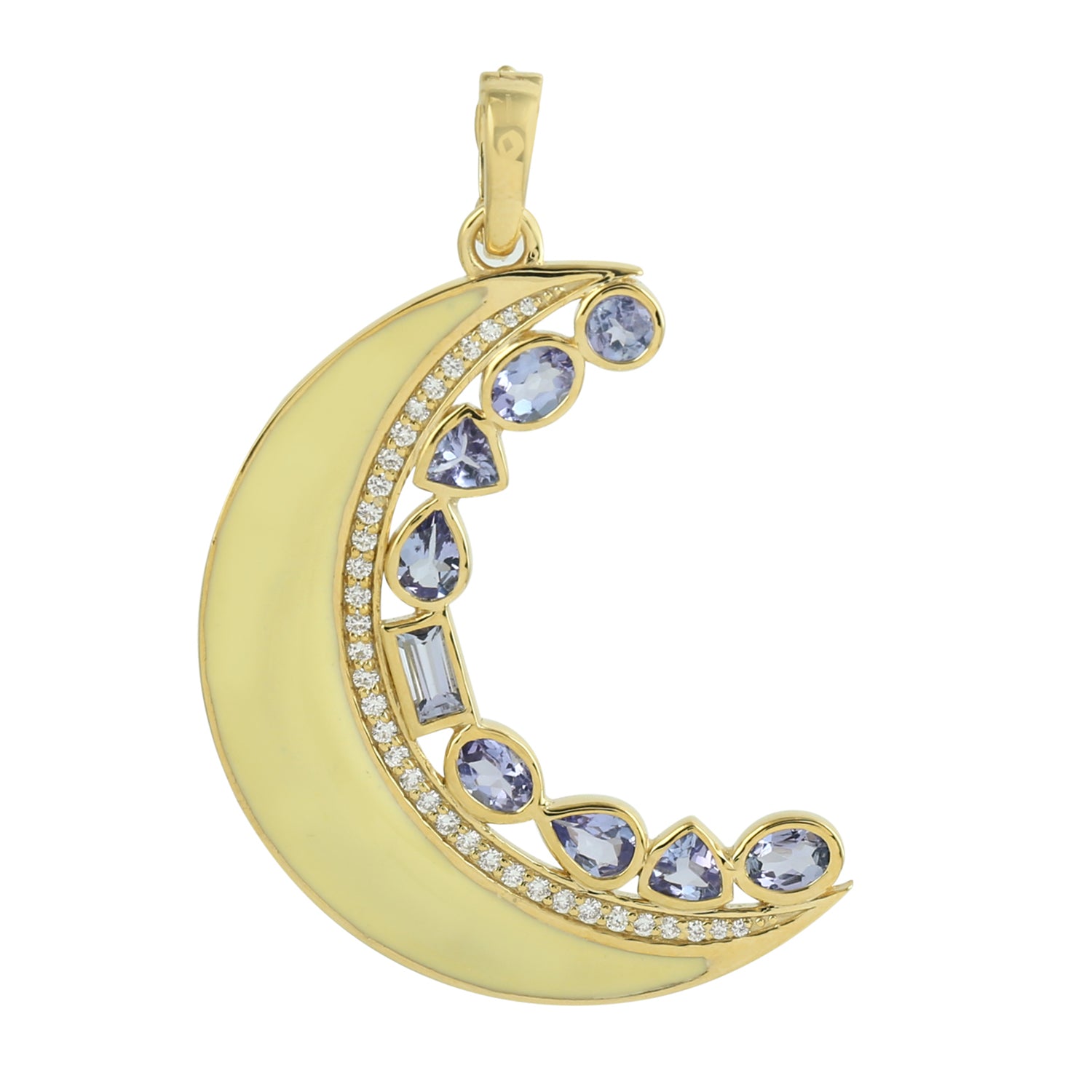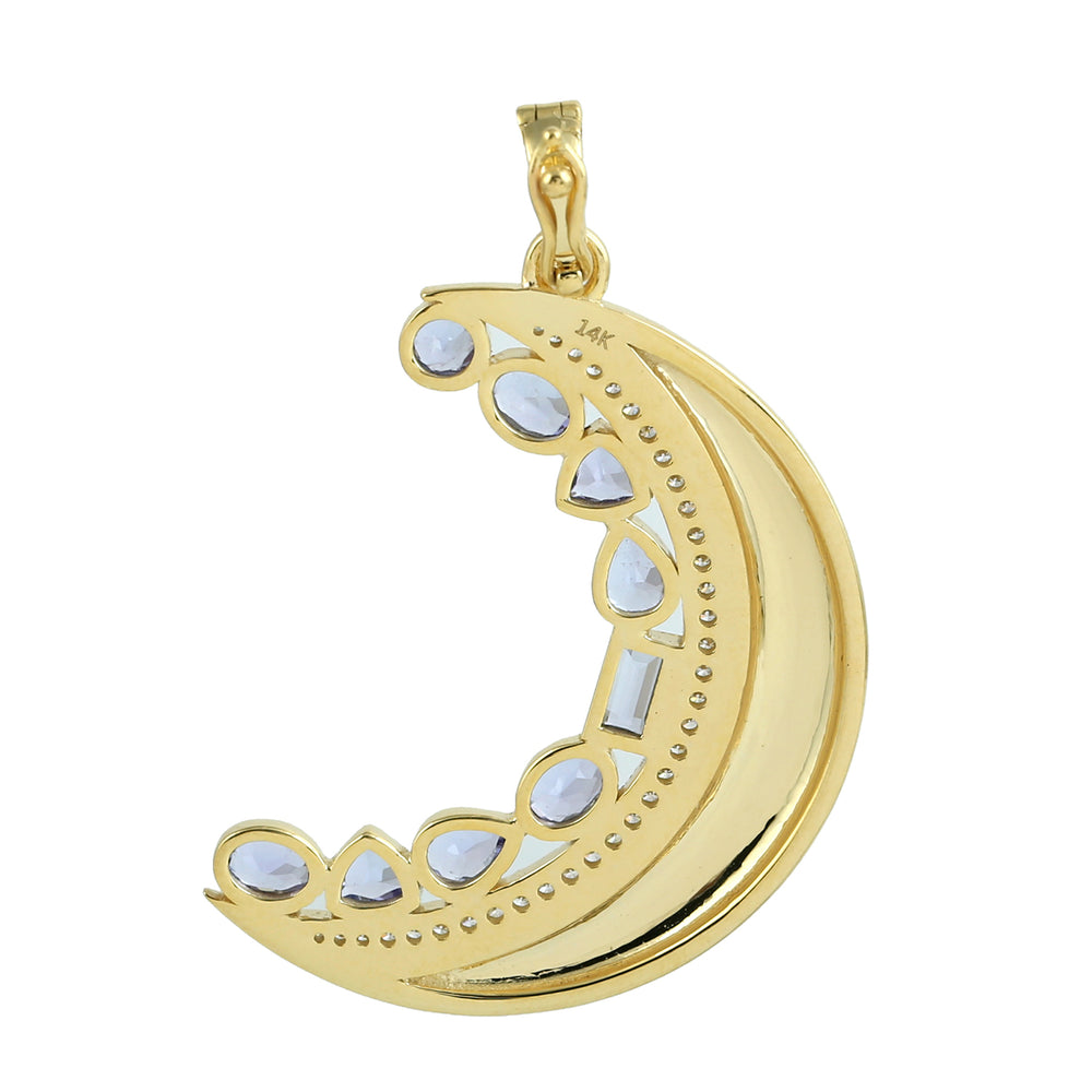 Micro Pave Diamond Bezel Set Tanzanite in 14k Yellow Gold Crescent Moon Pendant