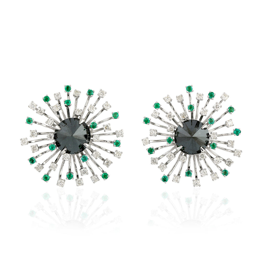 Black White Diamond Emerald Gemstone Sun Burst Stud Earrings In White Gold