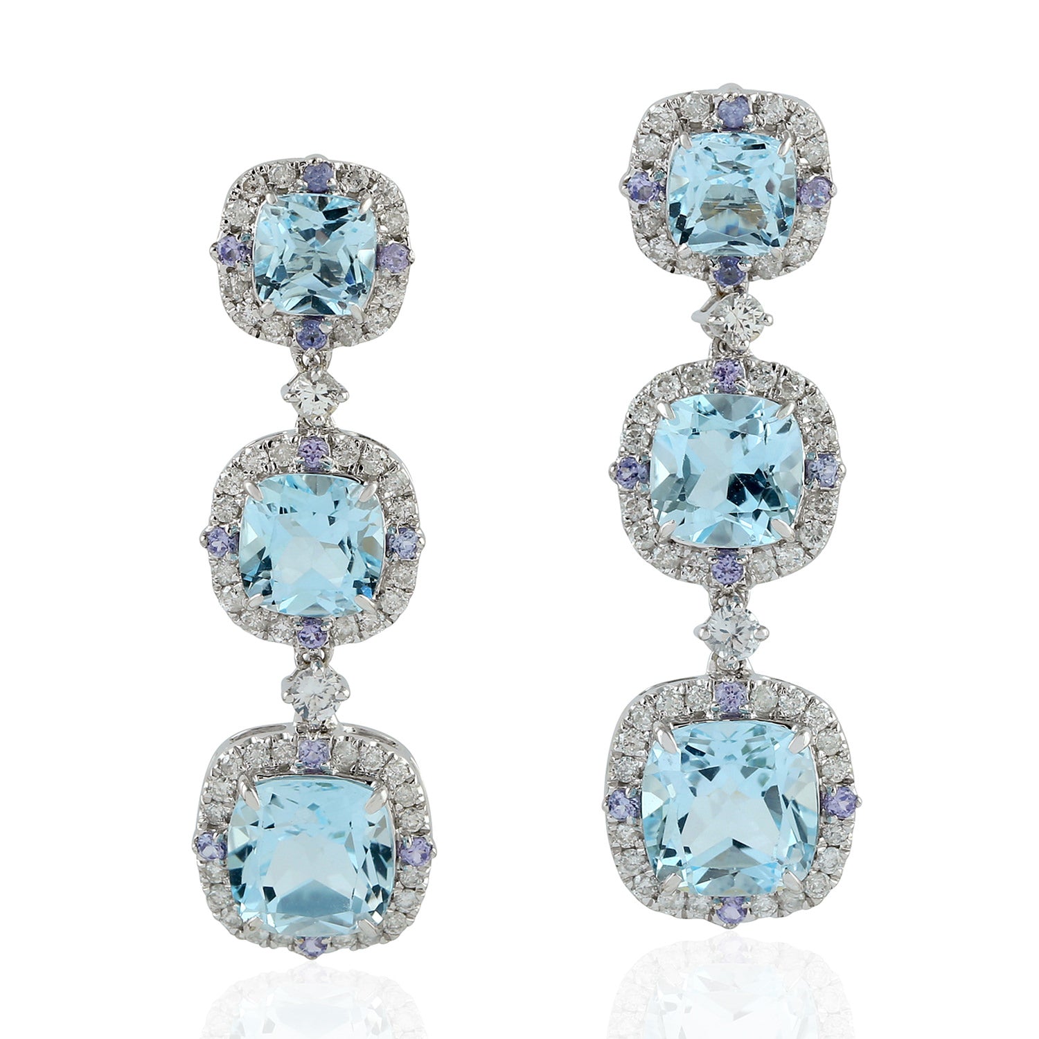 Cushion Blue Topaz Prong Tanzanite Sapphire Pave Diamond Dangler In White Gold