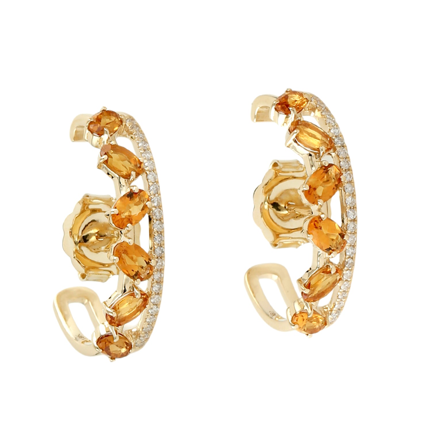 Oval Citrine Gemstone Pave Diamond Hoop Earrings in 18K Yellow Gold