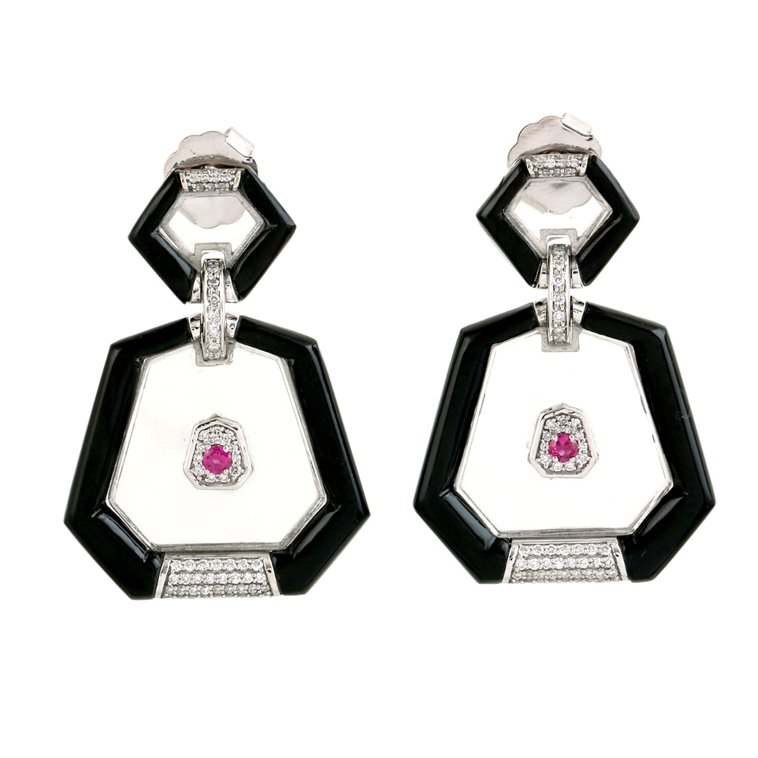 Black Onyx, Crystal ,Ruby & Diamond Art Deco Drop Earrings in 18K White Gold