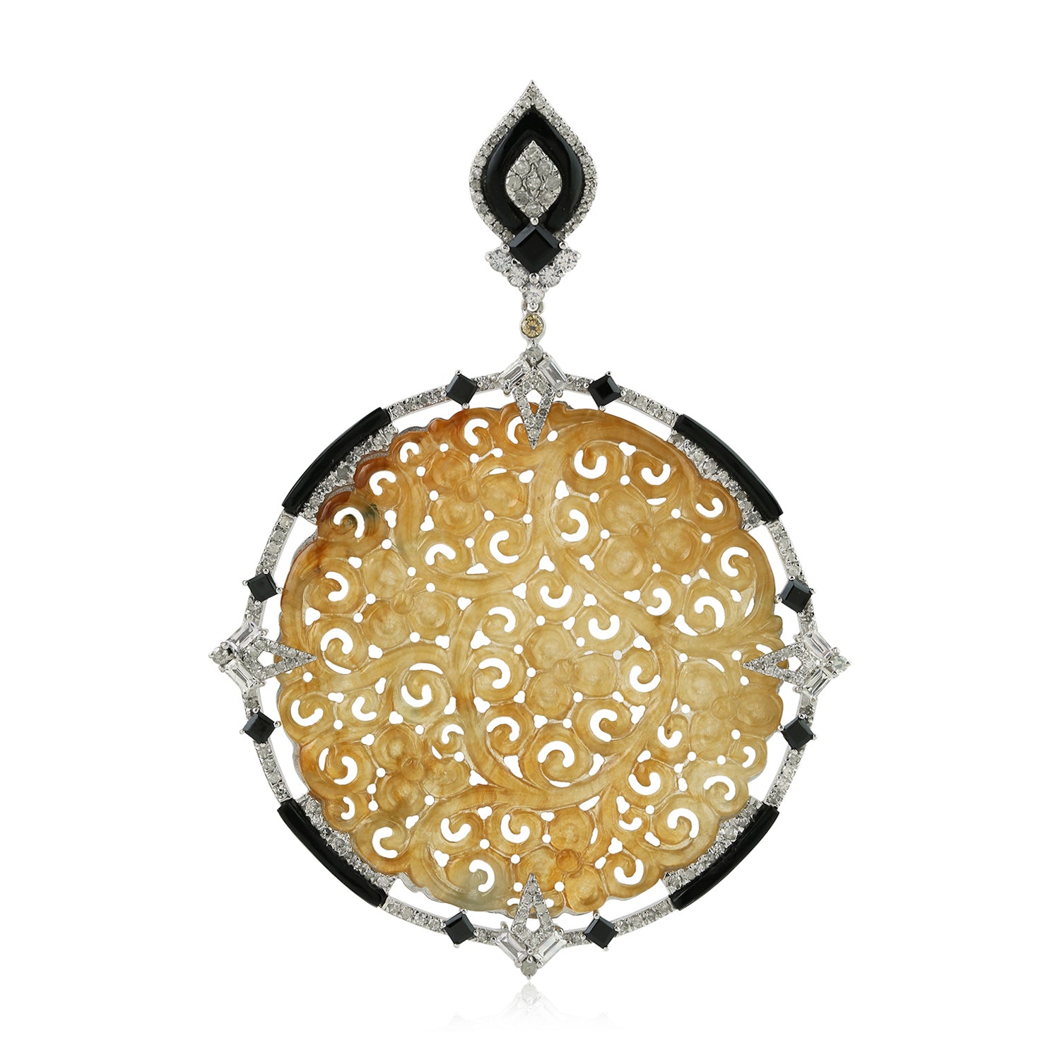 Carved Jade Medallion Pendant with Diamond, Onyx, Spinel & Sapphire in 18K White Gold & Silver