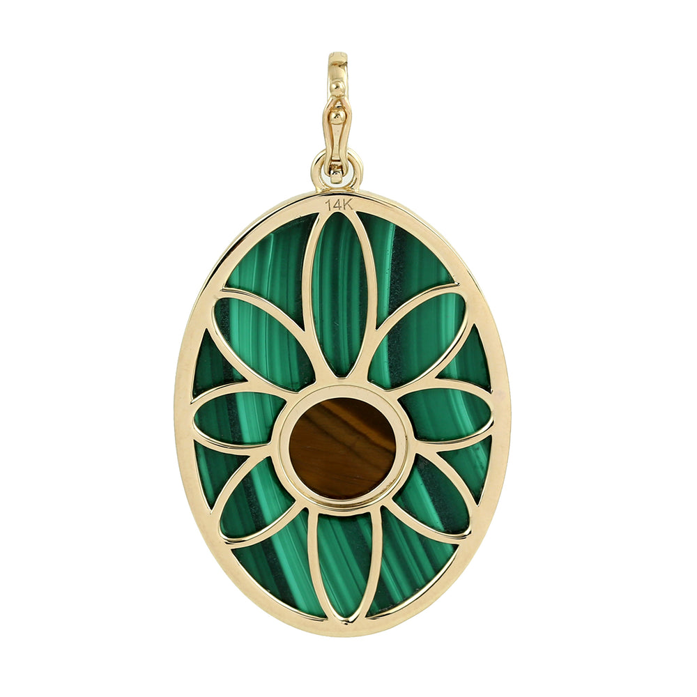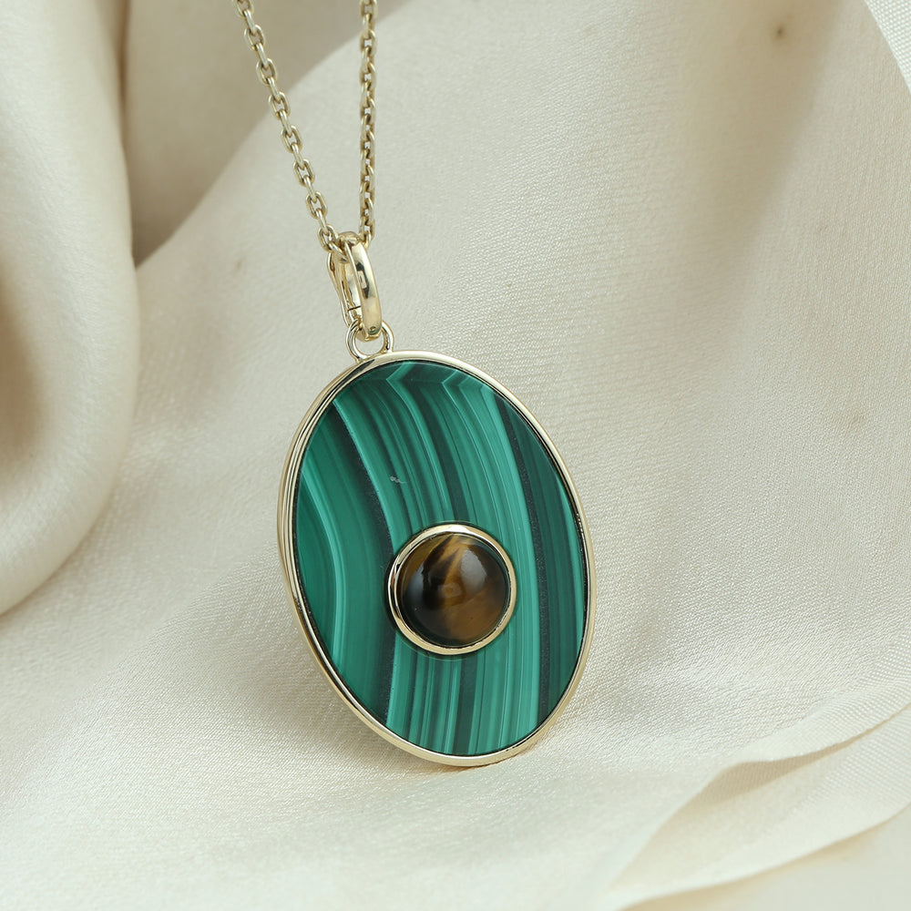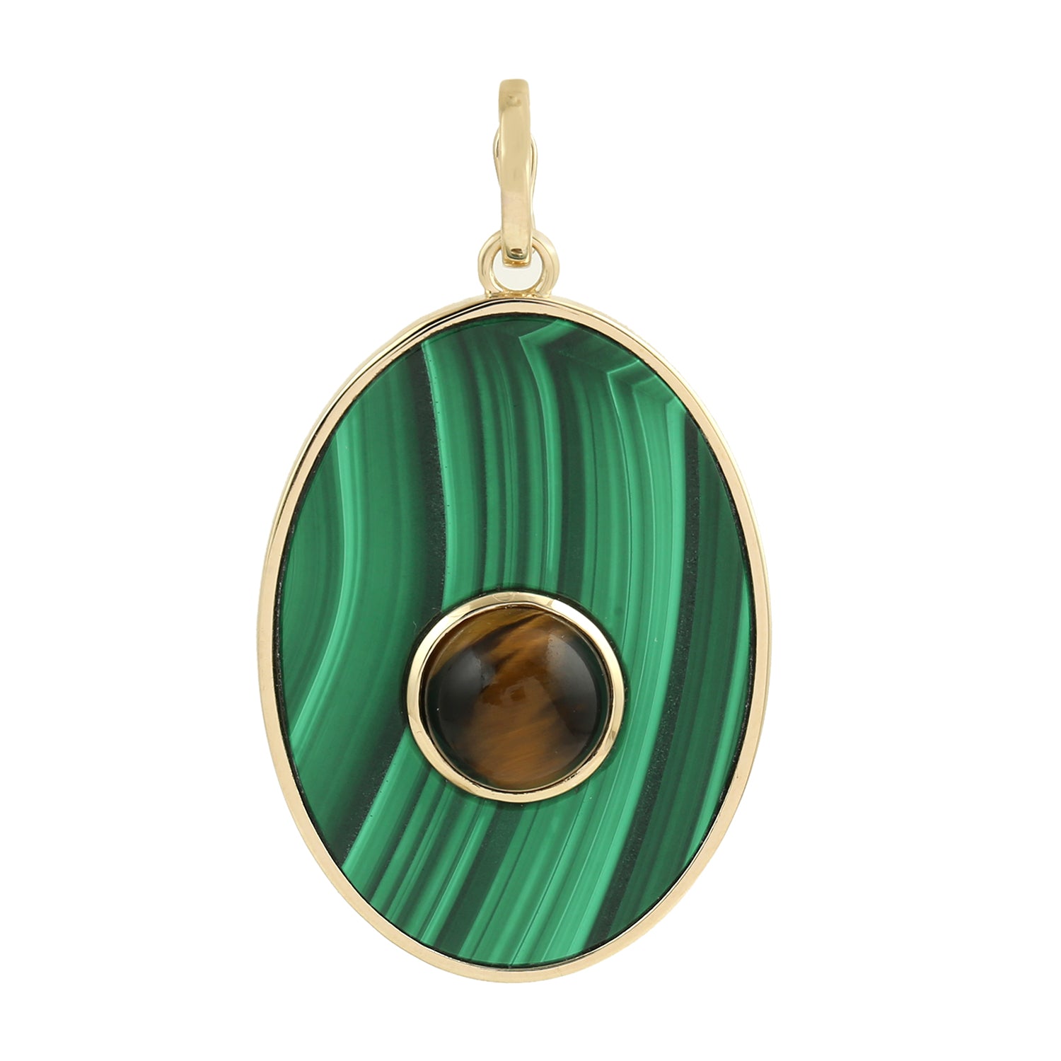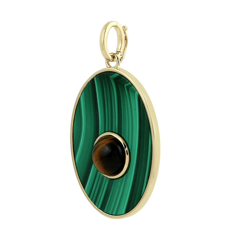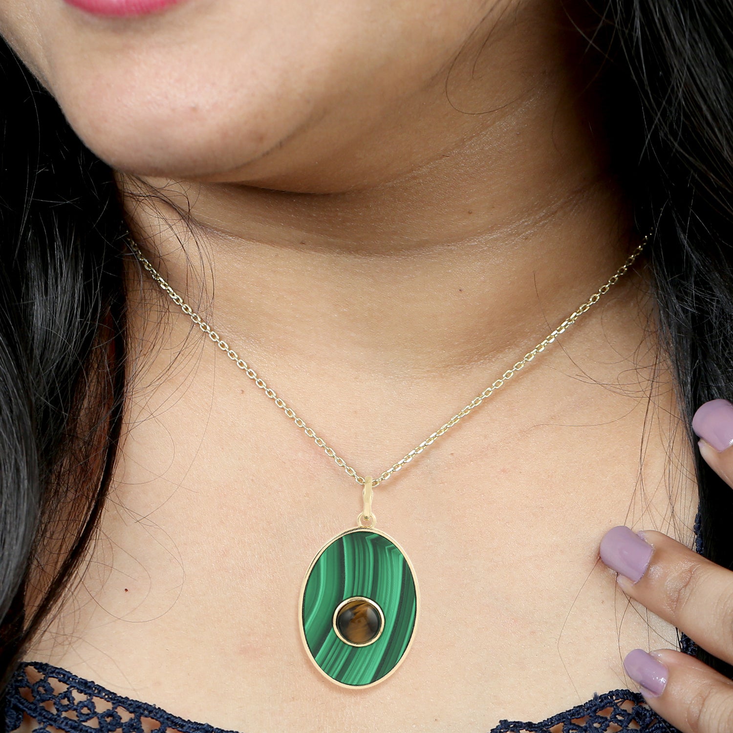 Oval Cut Malachite Bezel Set Tiger Eye Gemstone Charm Pendant In Yellow Gold