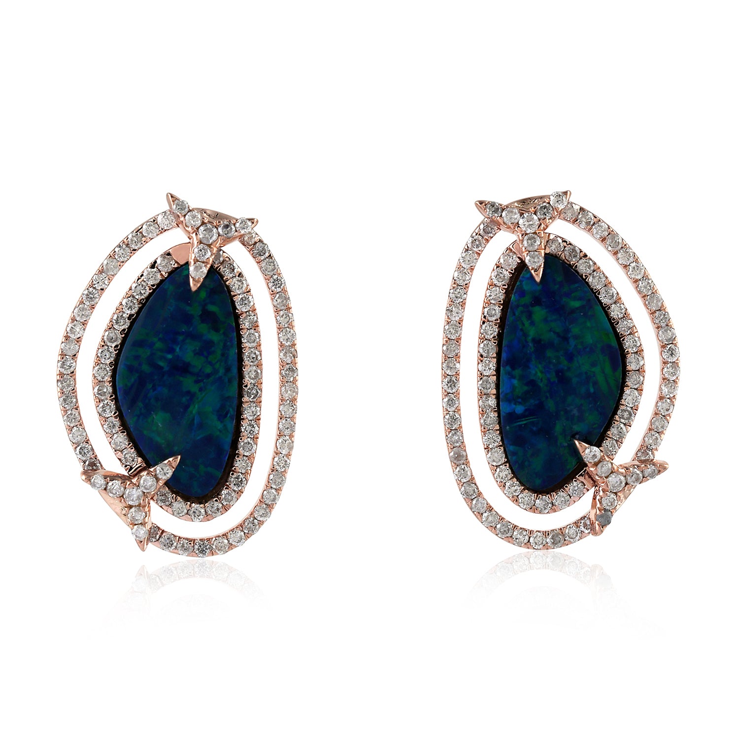 Blue Opal & Diamond Double Halo Teardrop Stud Earrings in 18K Rose Gold