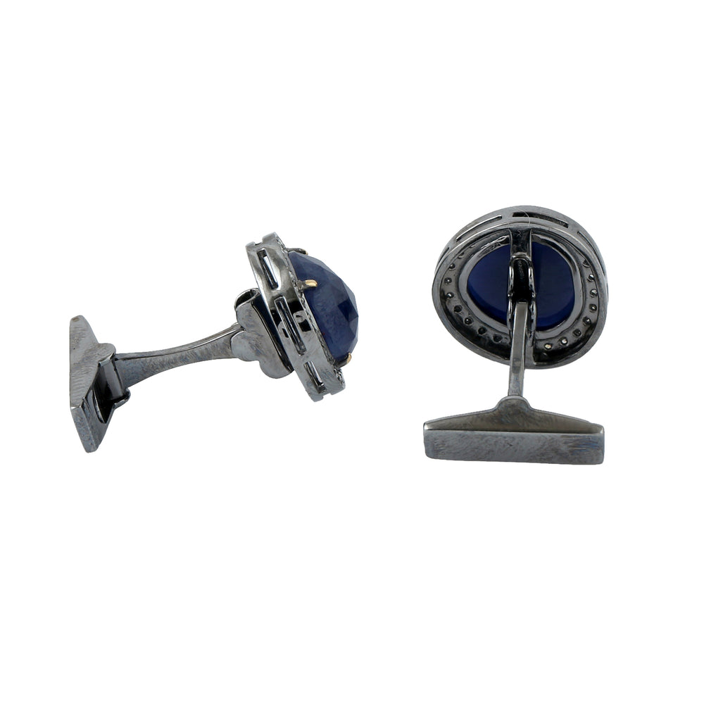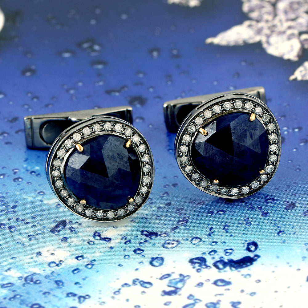 Natural Blue Sapphire Pave Diamond Silver Gold Cufflinks For Gift