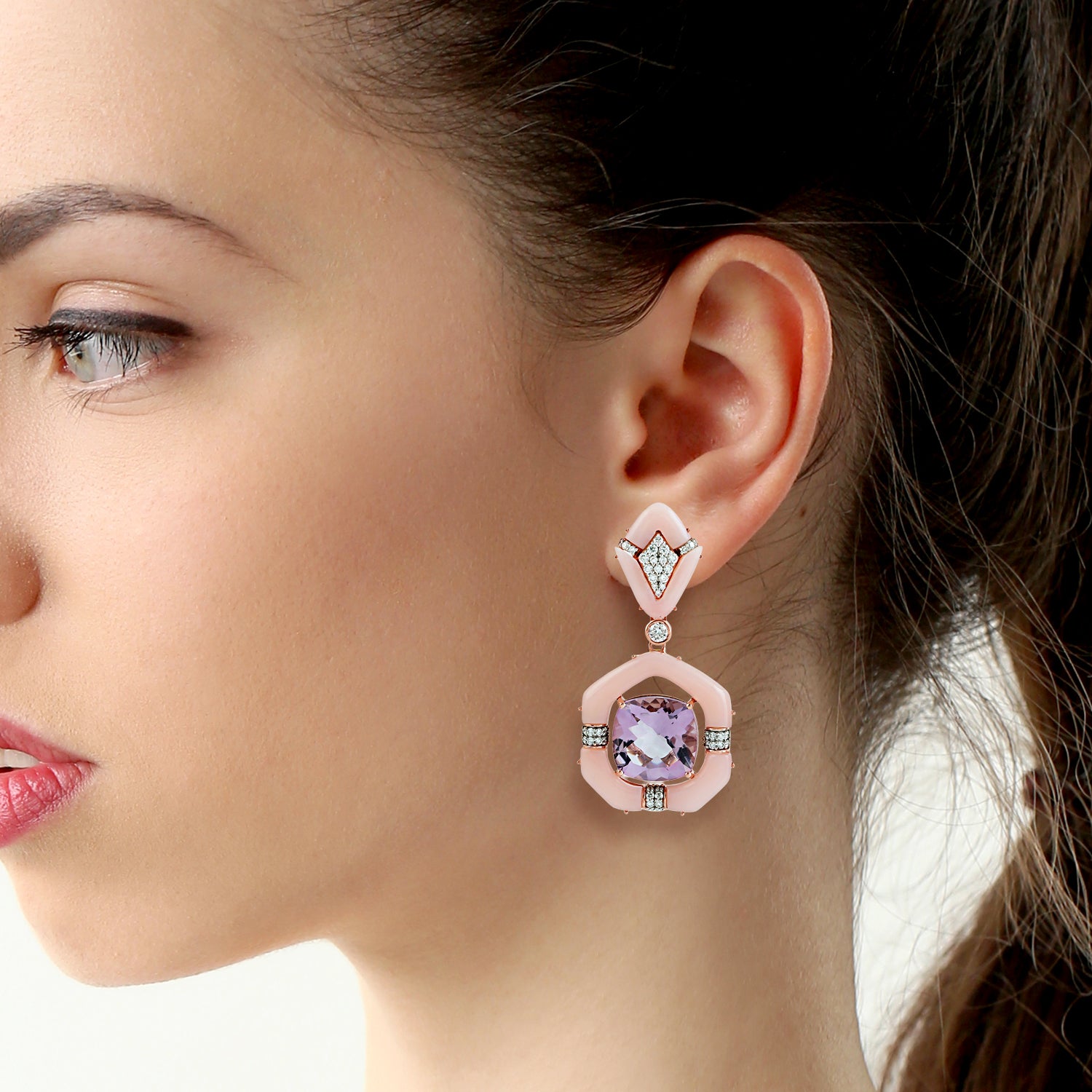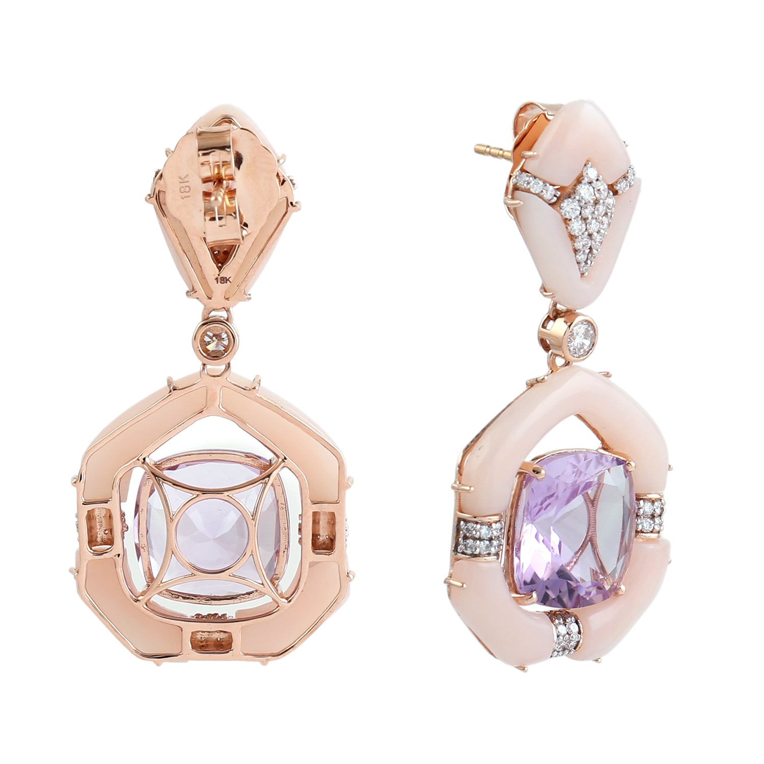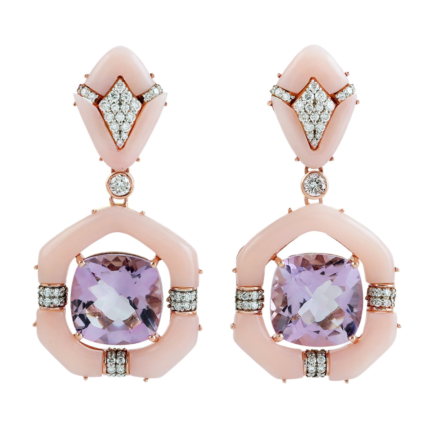 Pink Opal & Cushion Amethyst Diamond Drop Earrings in 18K Rose Gold