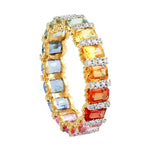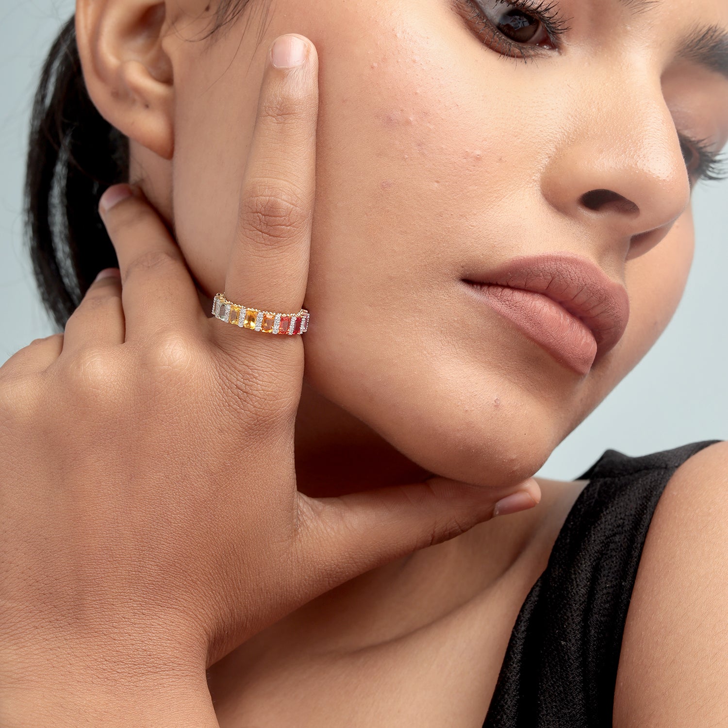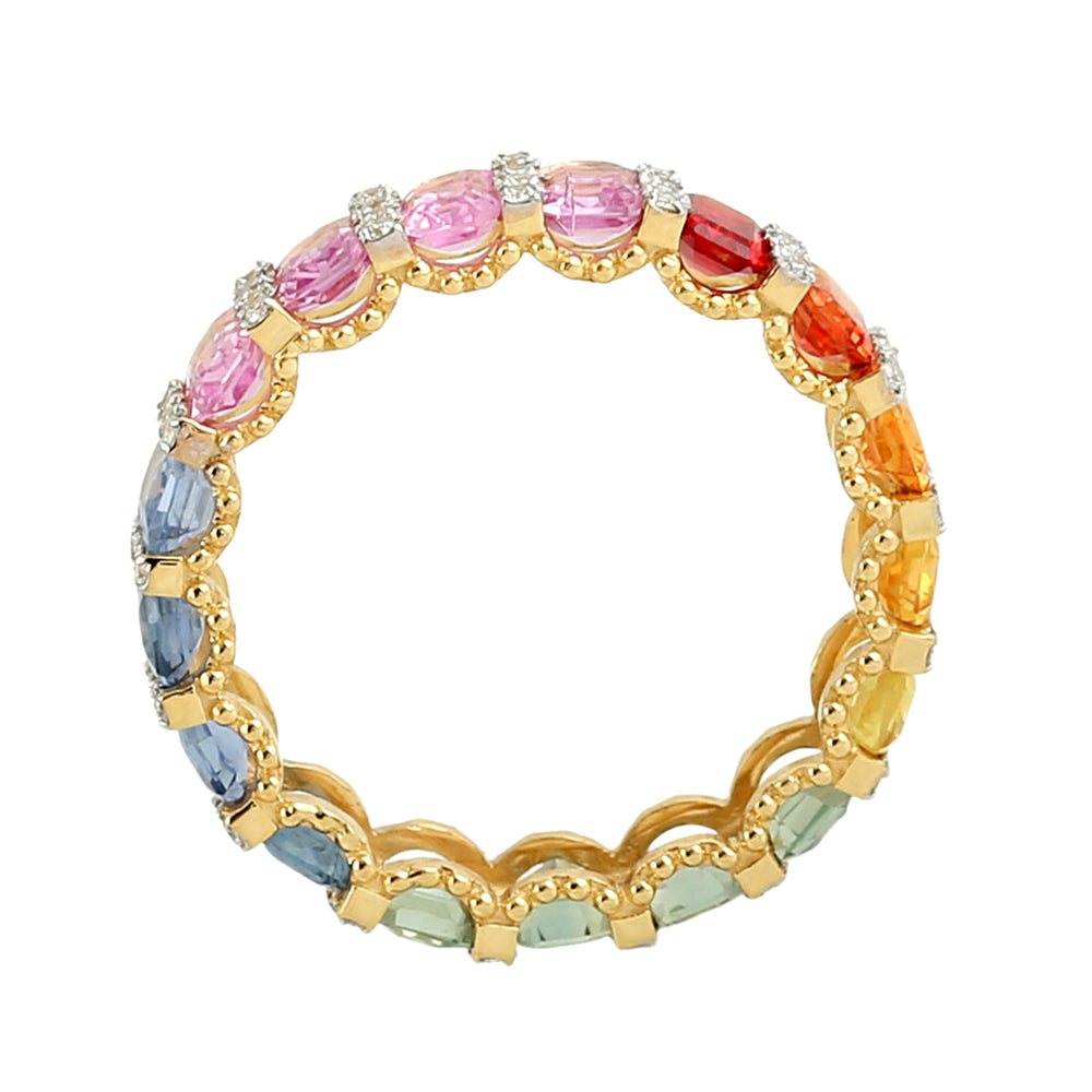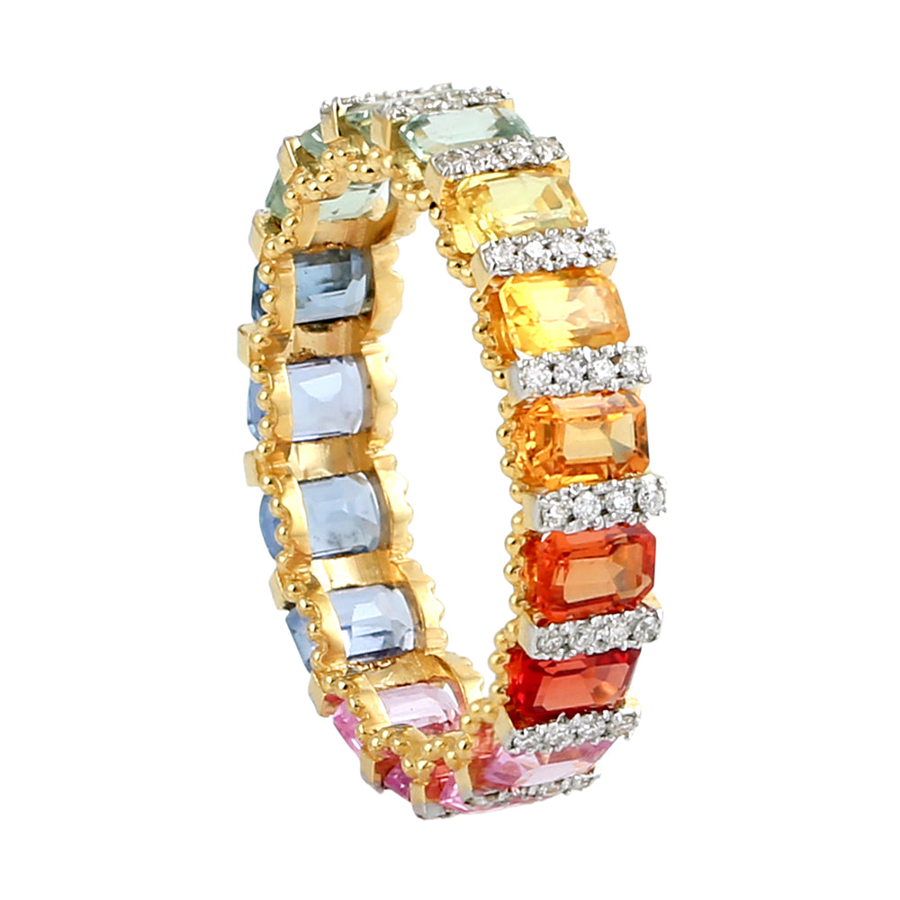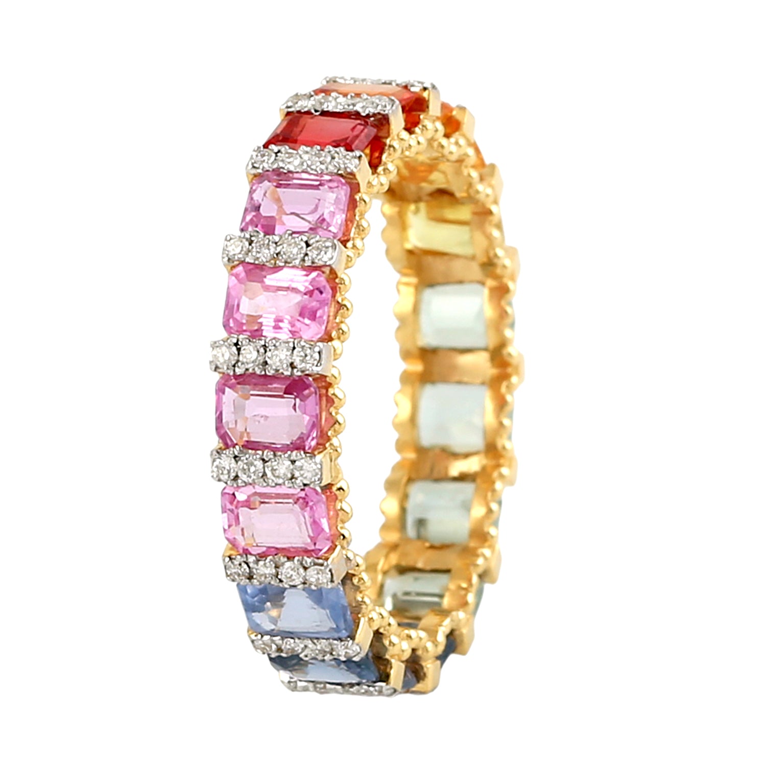 Baguette Cut Multi Sapphire Pave Diamond full Eternity Band Ring In Yellow Gold