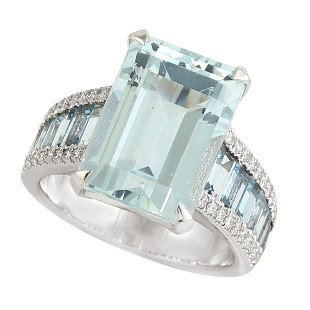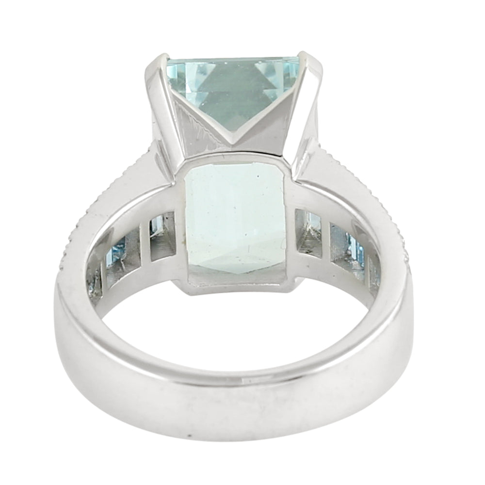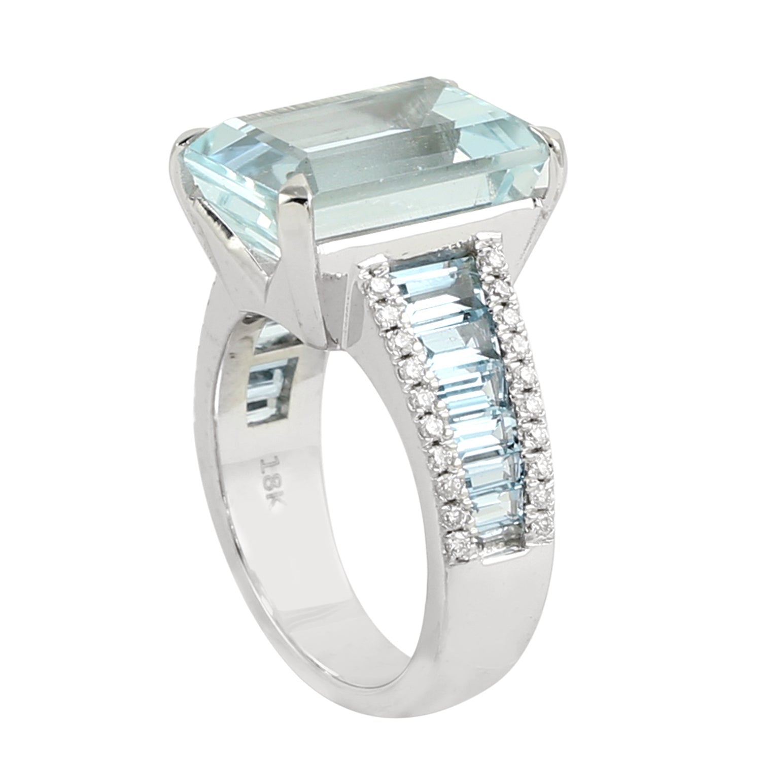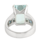 Baguette Cut Aquamarine Solitaire Ring with Pave Diamonds in 18K White Gold – Elegant Gift for Her