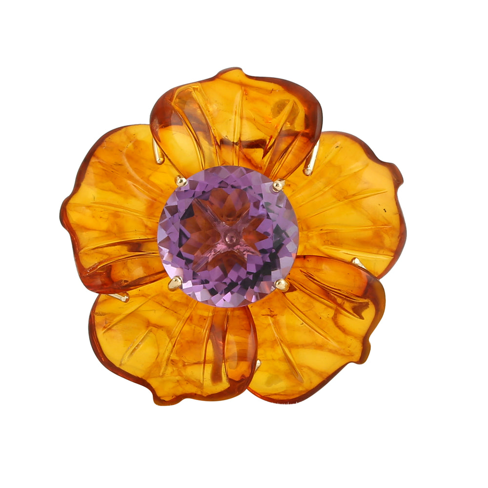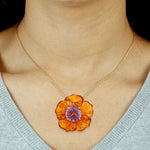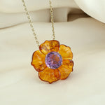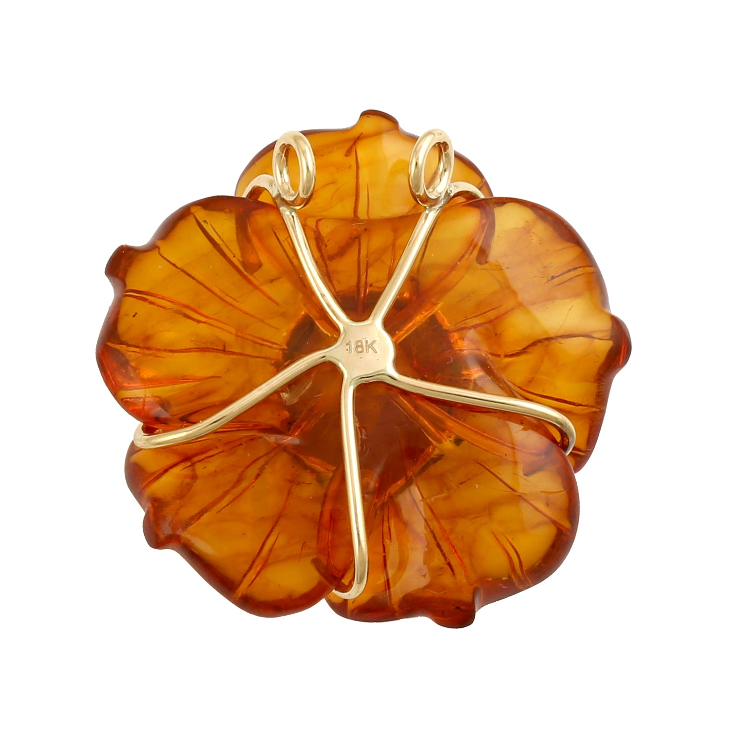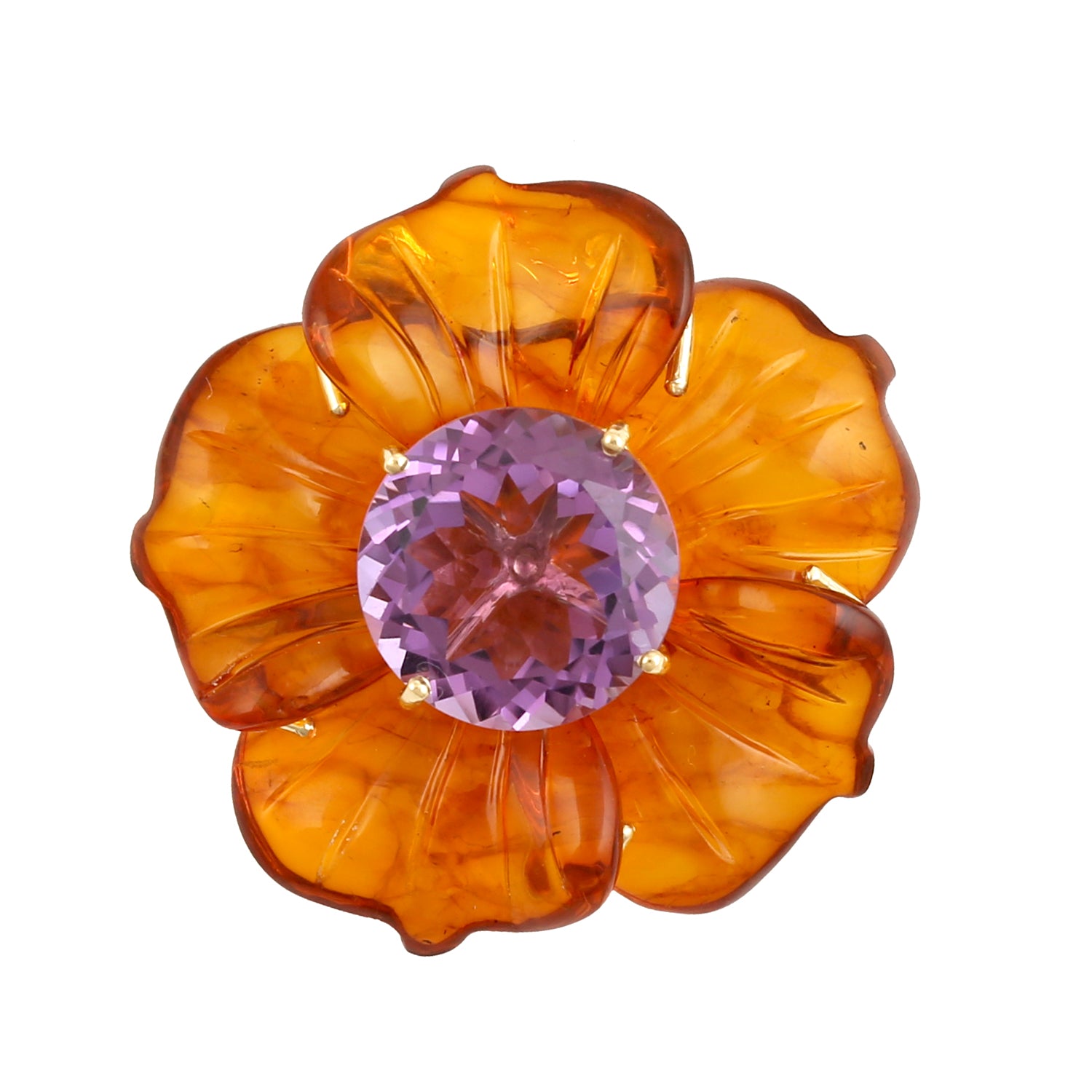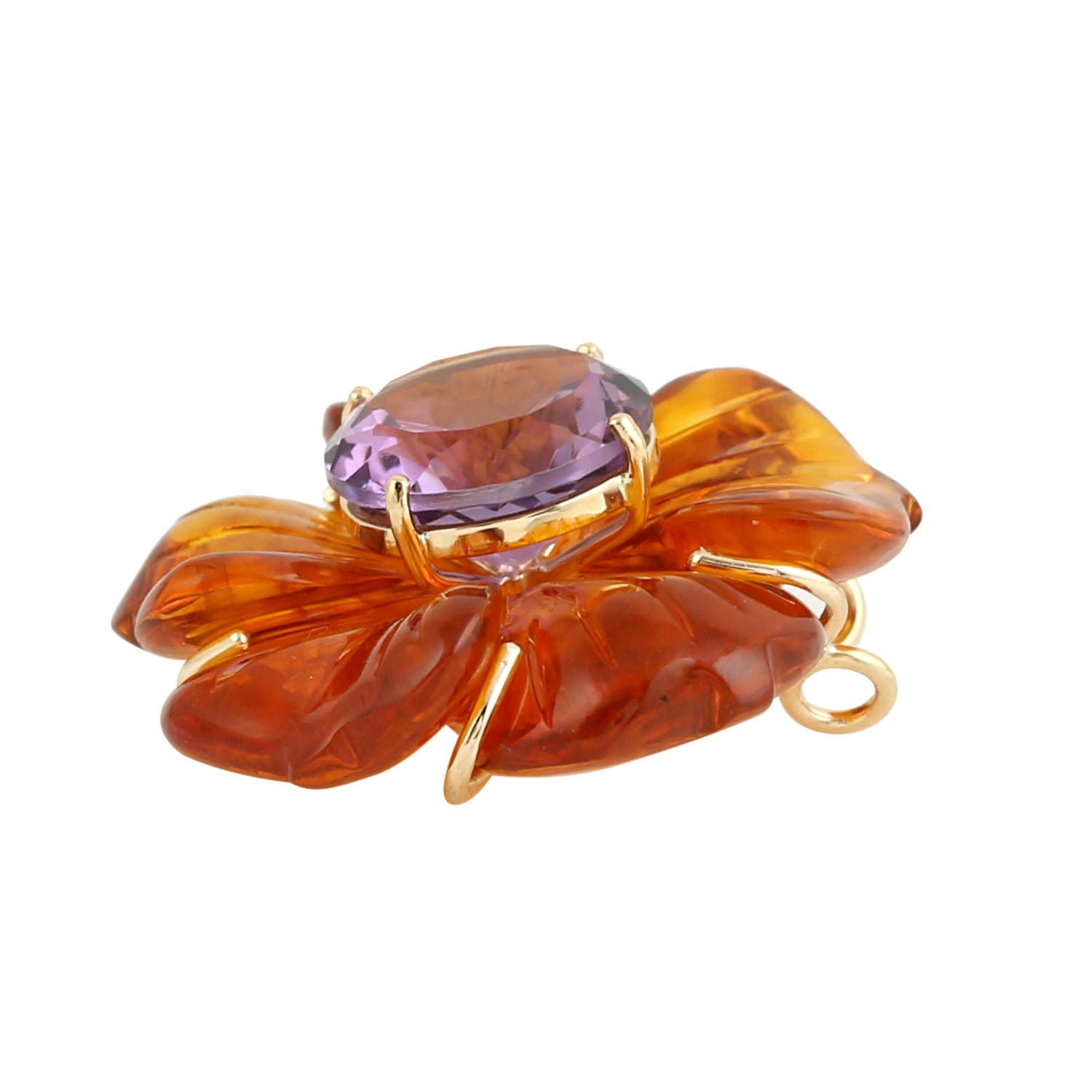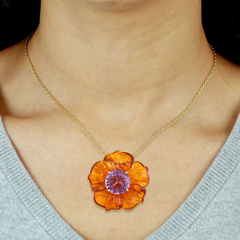 Carved Amber Round Amethyst Gemstone In 18K Yellow Gold Flower Pendant