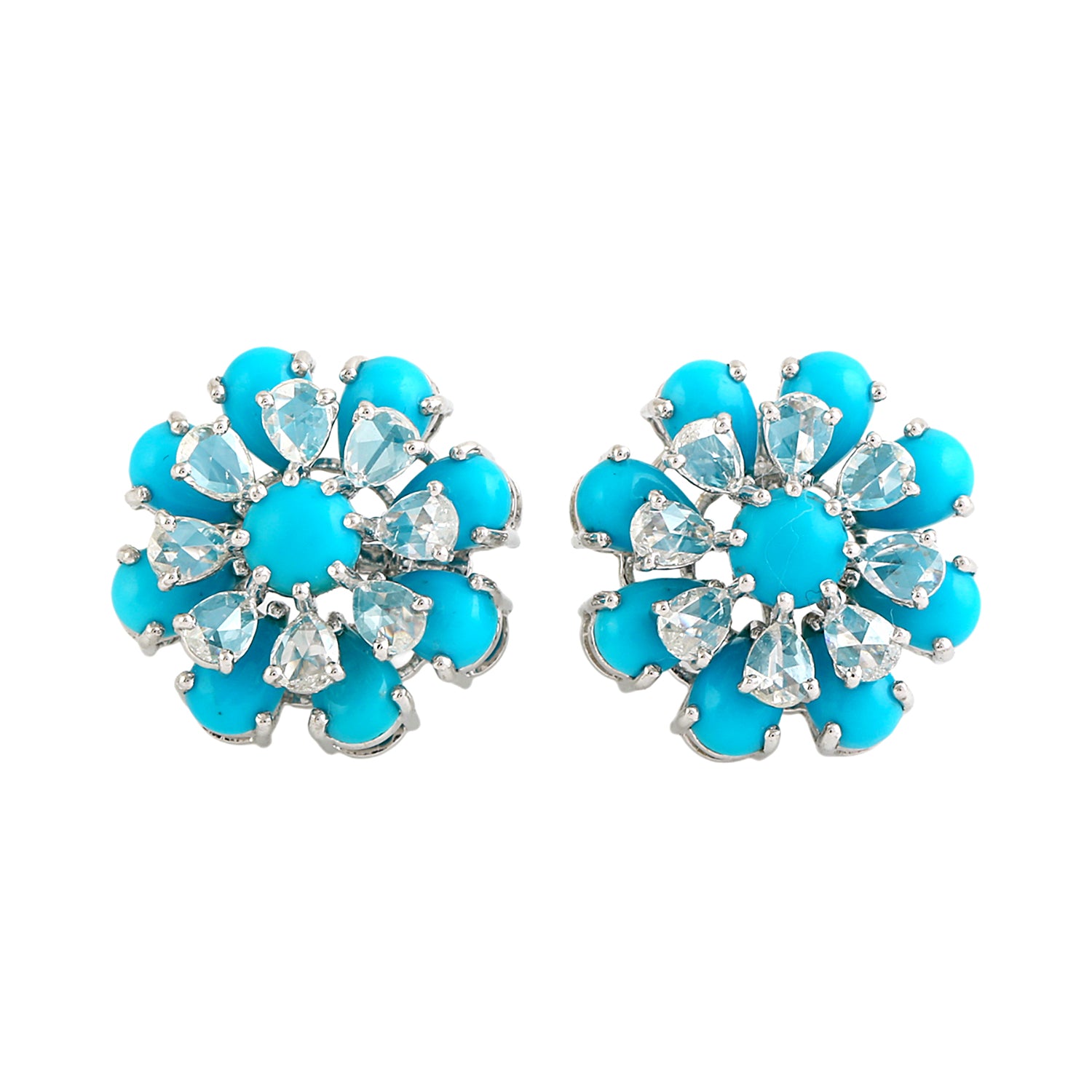 Pear Cut Turquoise Rose Cut Flower Jacket Stud Earrings In 18K White gold