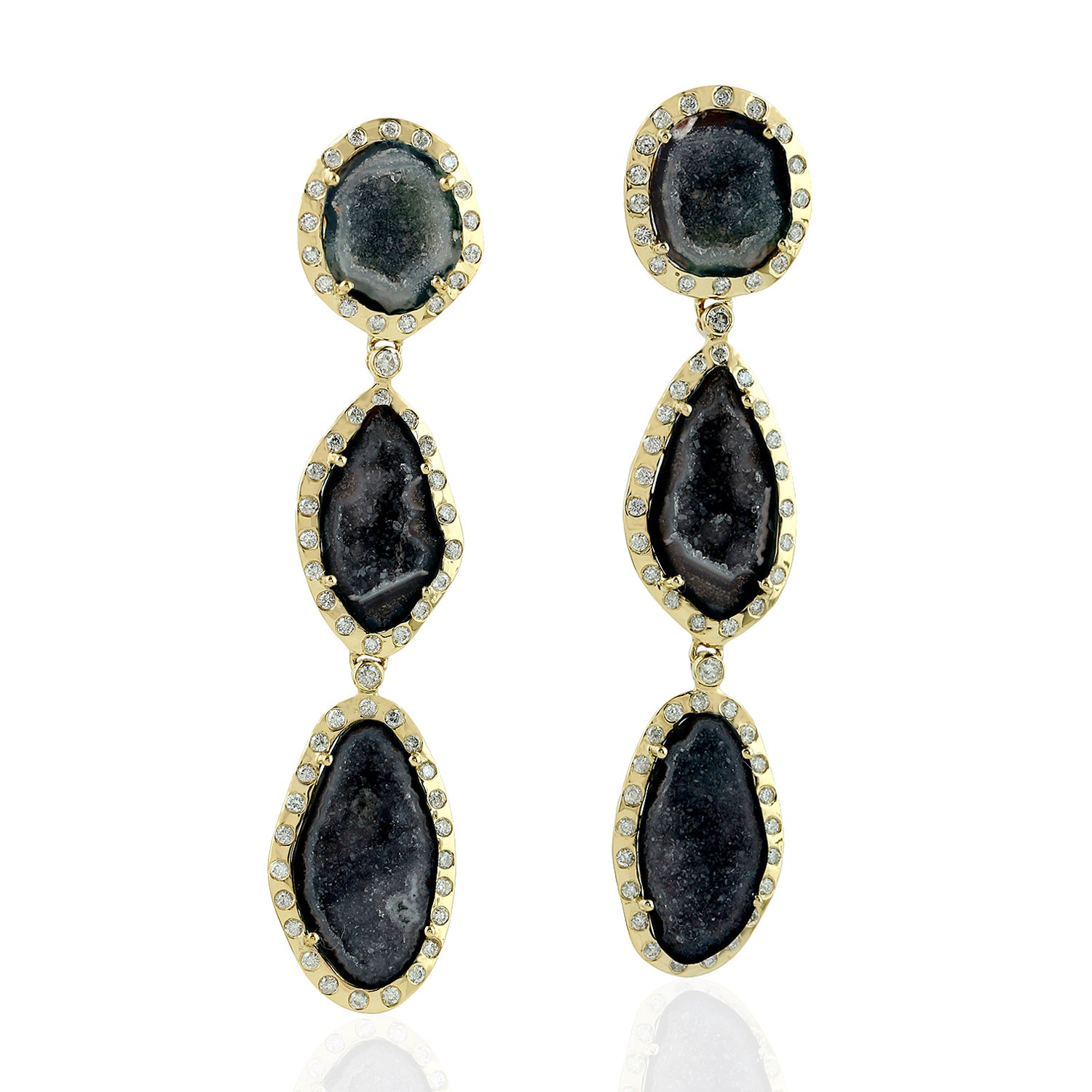 Black Geode Triple-Drop Diamond Halo Dangle Earrings in 18K Yellow Gold