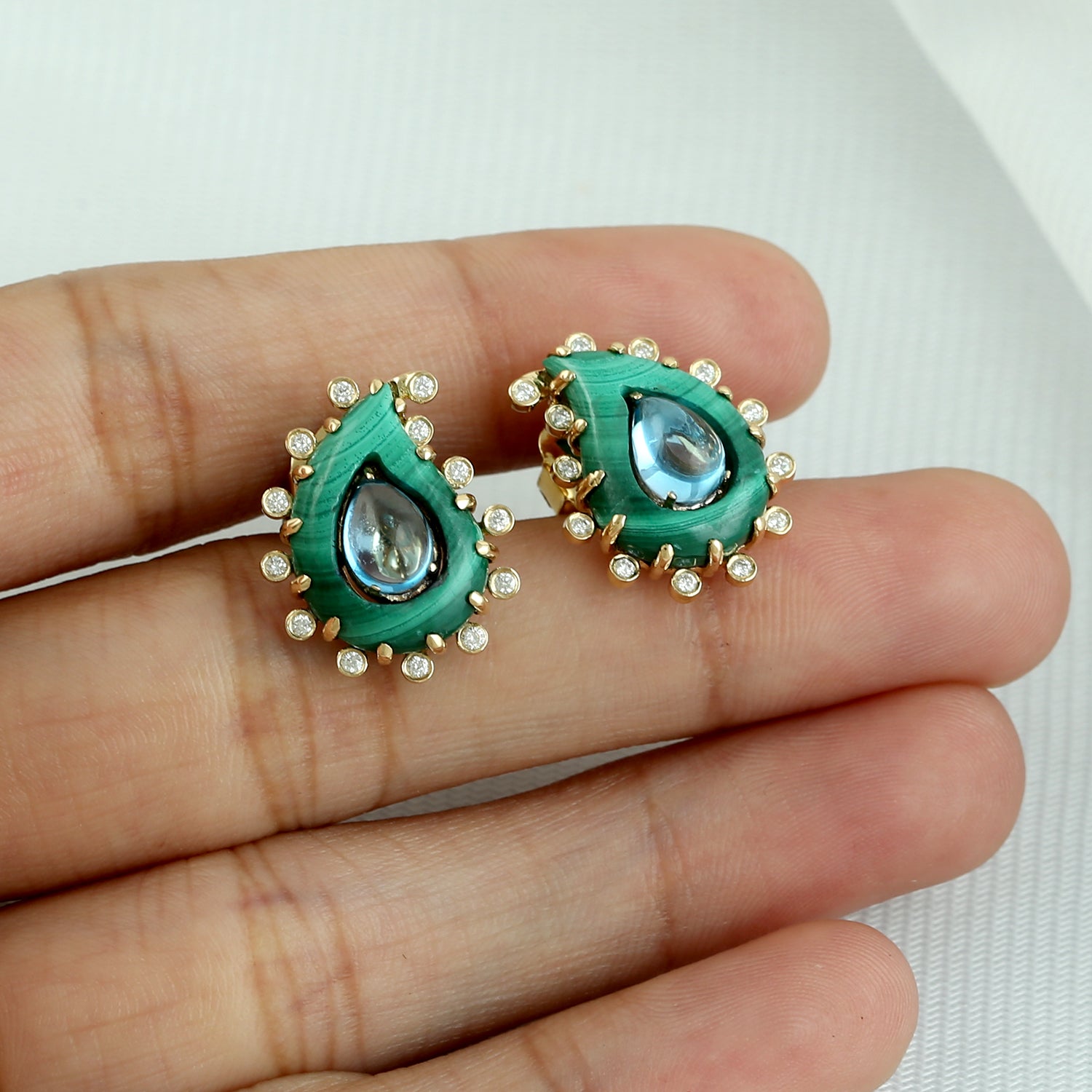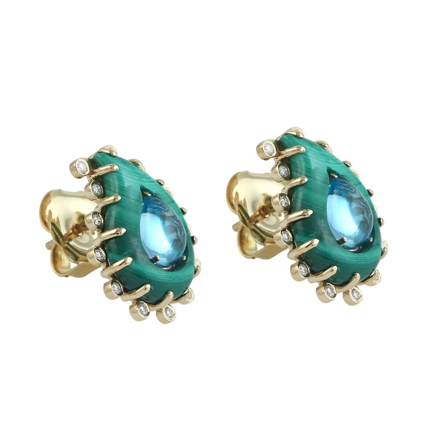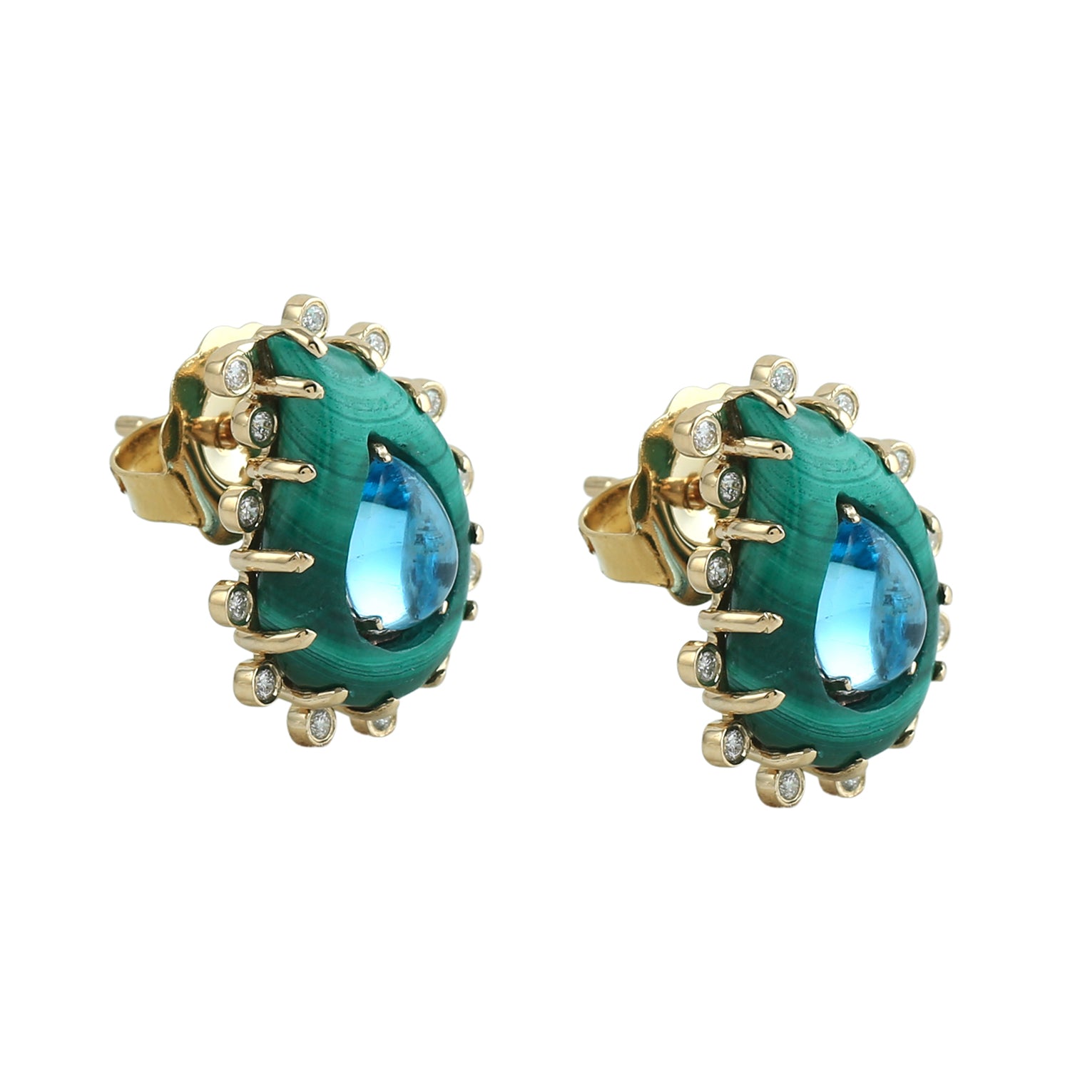 Malachite & Pear-Shaped Blue Topaz Diamond Stud Earrings in 18K Yellow Gold