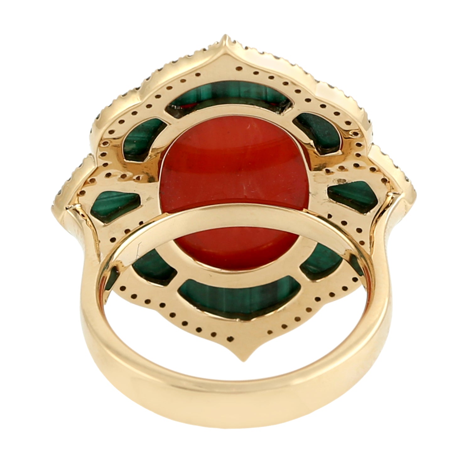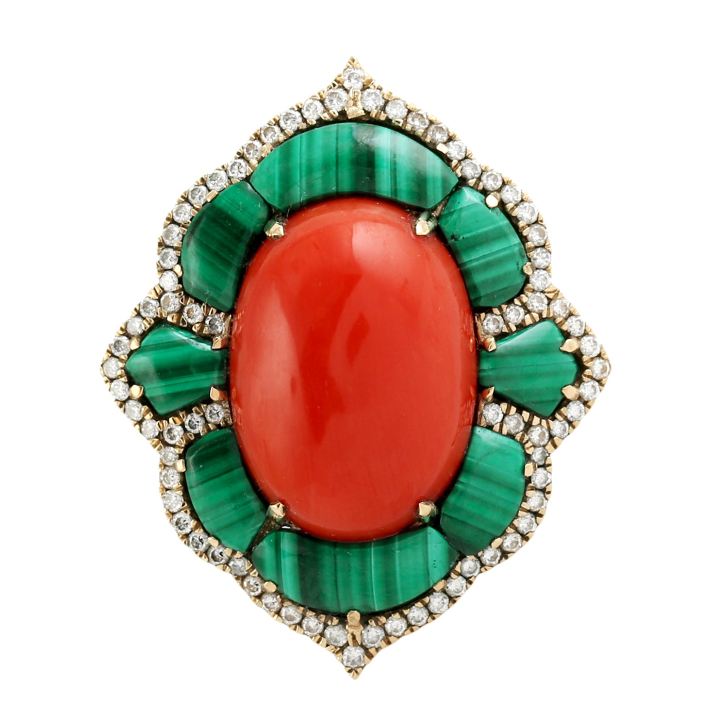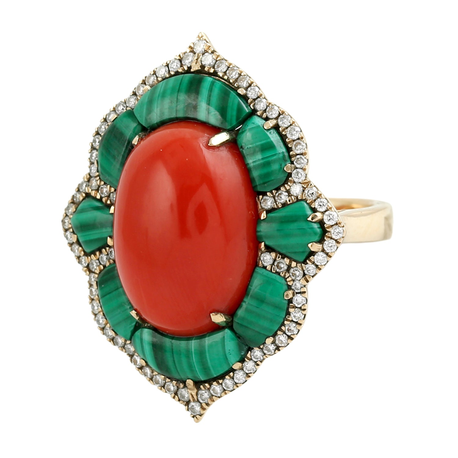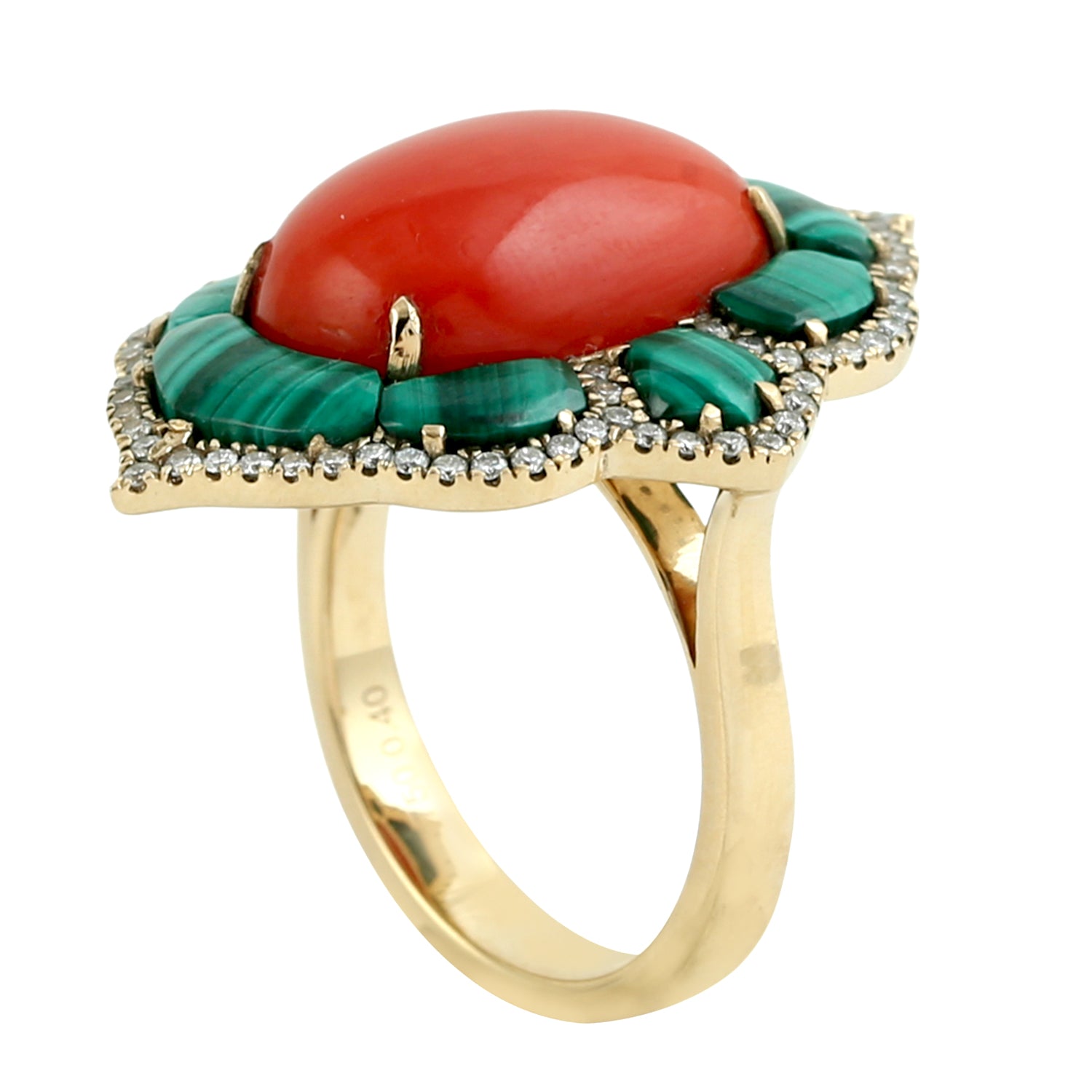 Oval Coral Ring with Malachite Halo & Diamond in 18K Yellow Gold