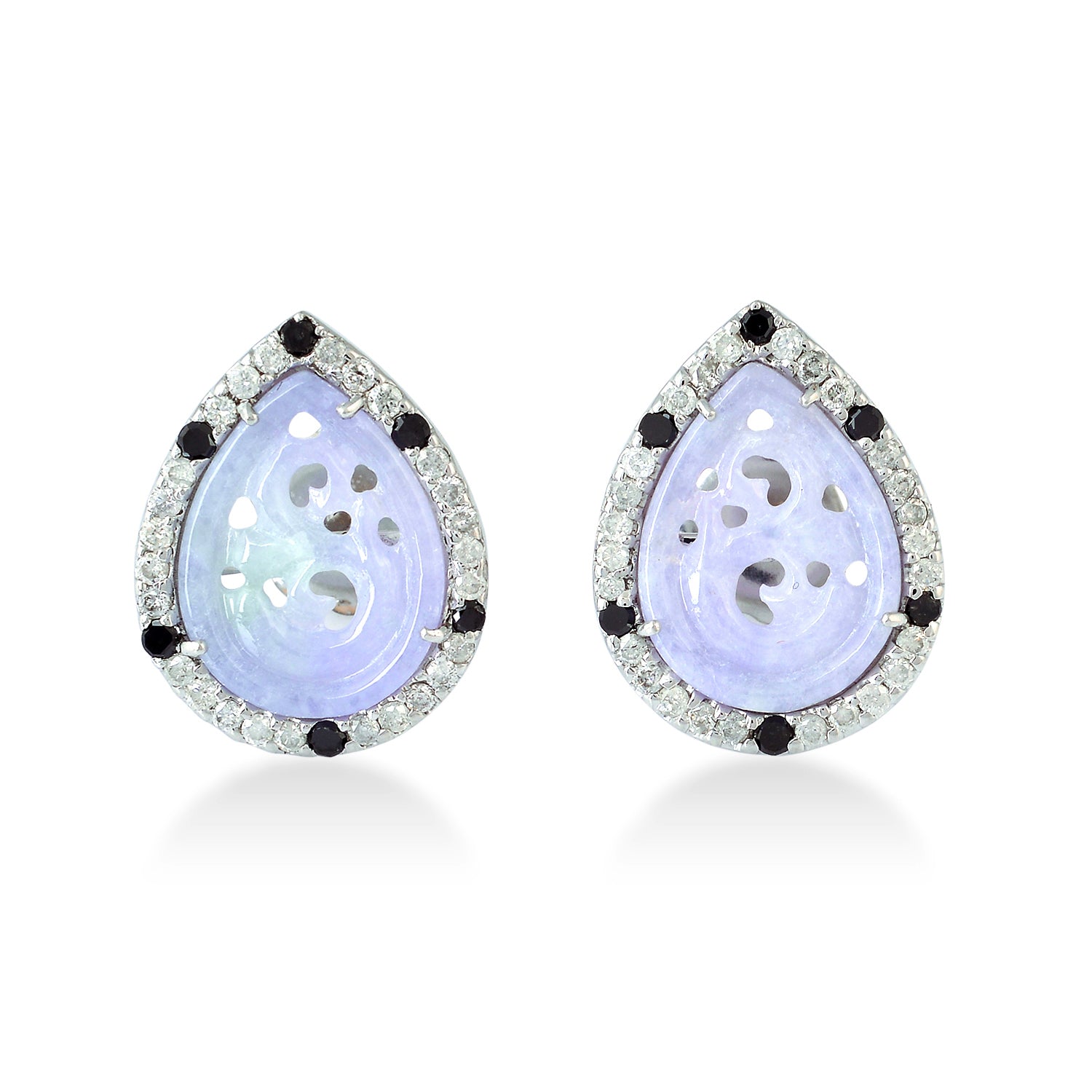 18K White Gold Lavender Jade Pear Stud Earrings Black and White Diamond Halo