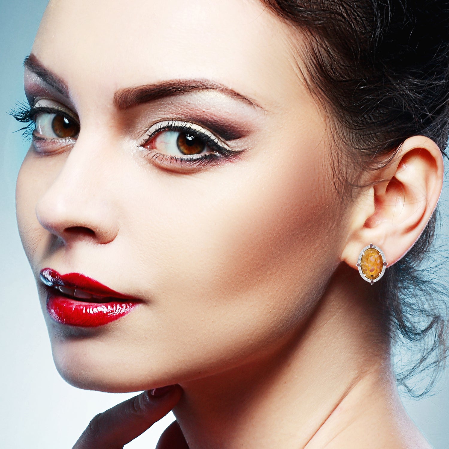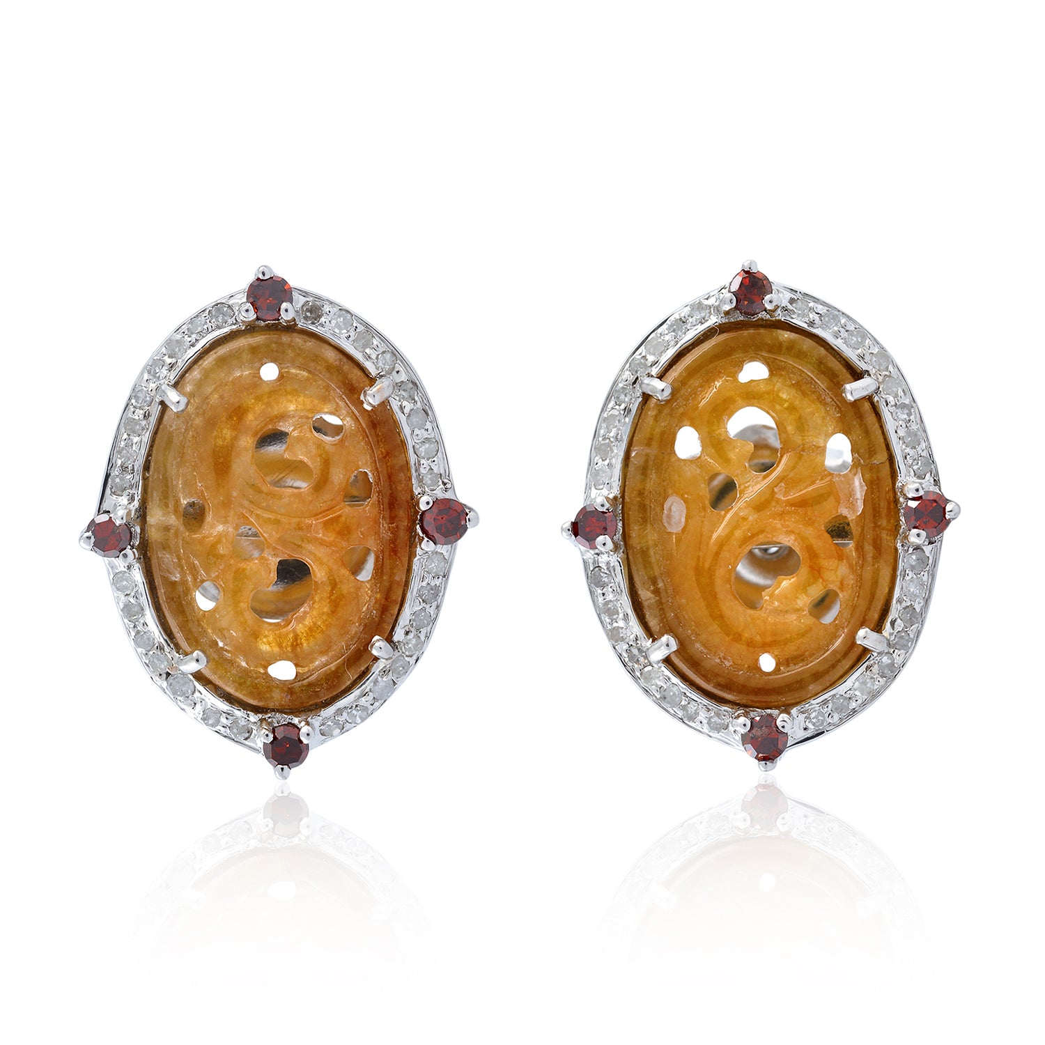 Carved Yellow Jade & Diamond Oval Earrings in 18K White Gold Silver