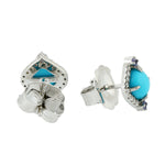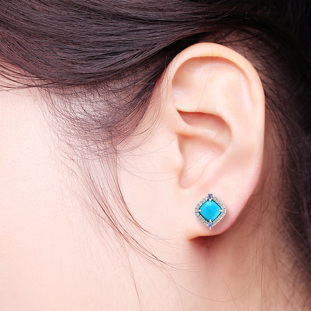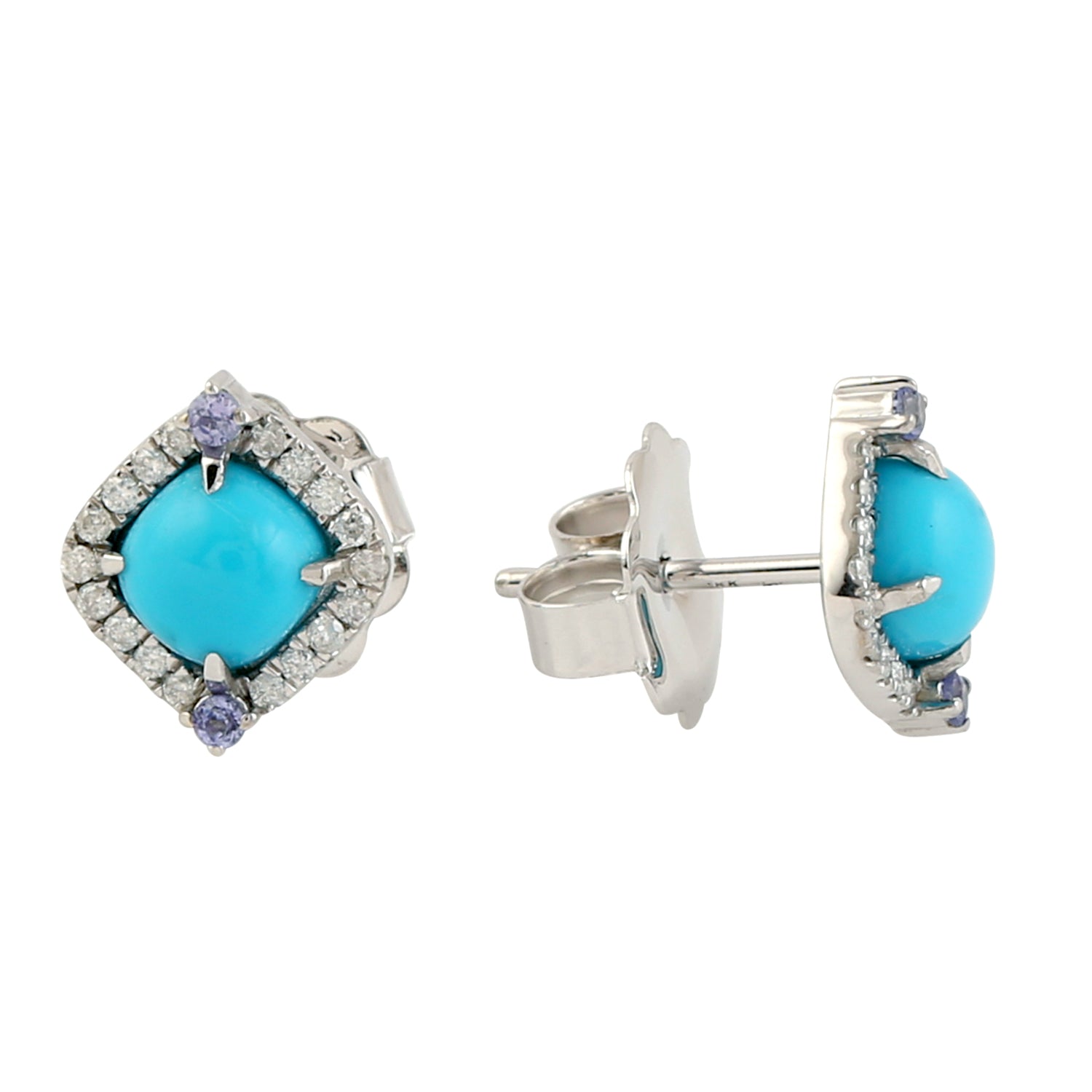 Turquoise Prong Tanzanite Gemstone Pave Diamond In White Gold Stud Earrings
