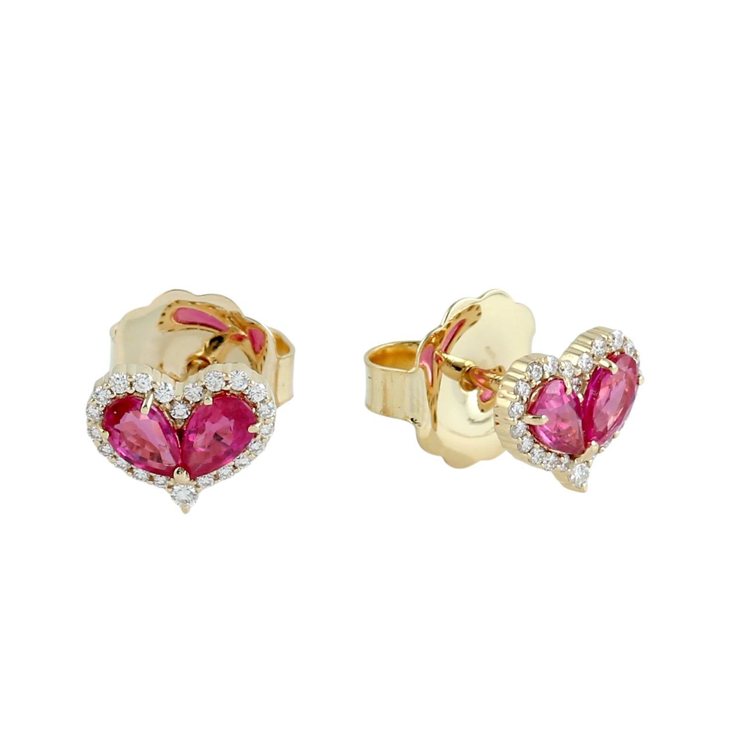 Pear Cut Ruby & Diamond Heart Stud Earrings in 18K Yellow Gold