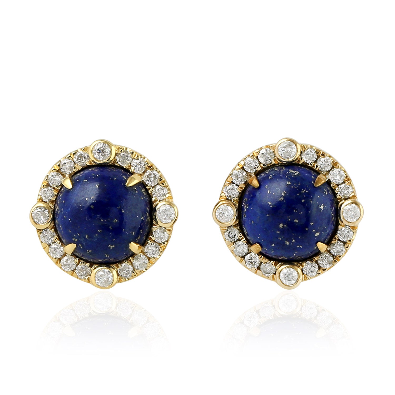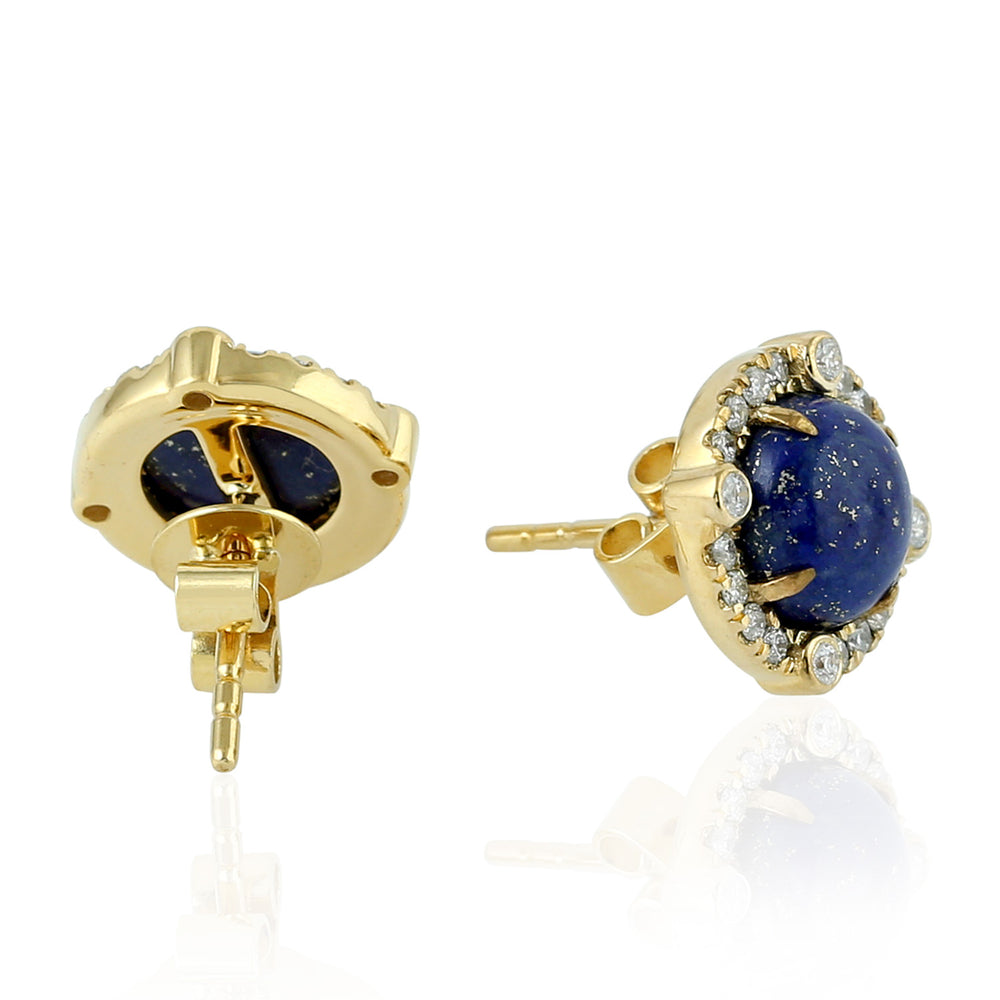 Lapis Gemstone Pave Diamond Round Stud Earring In 18k Yellow Gold